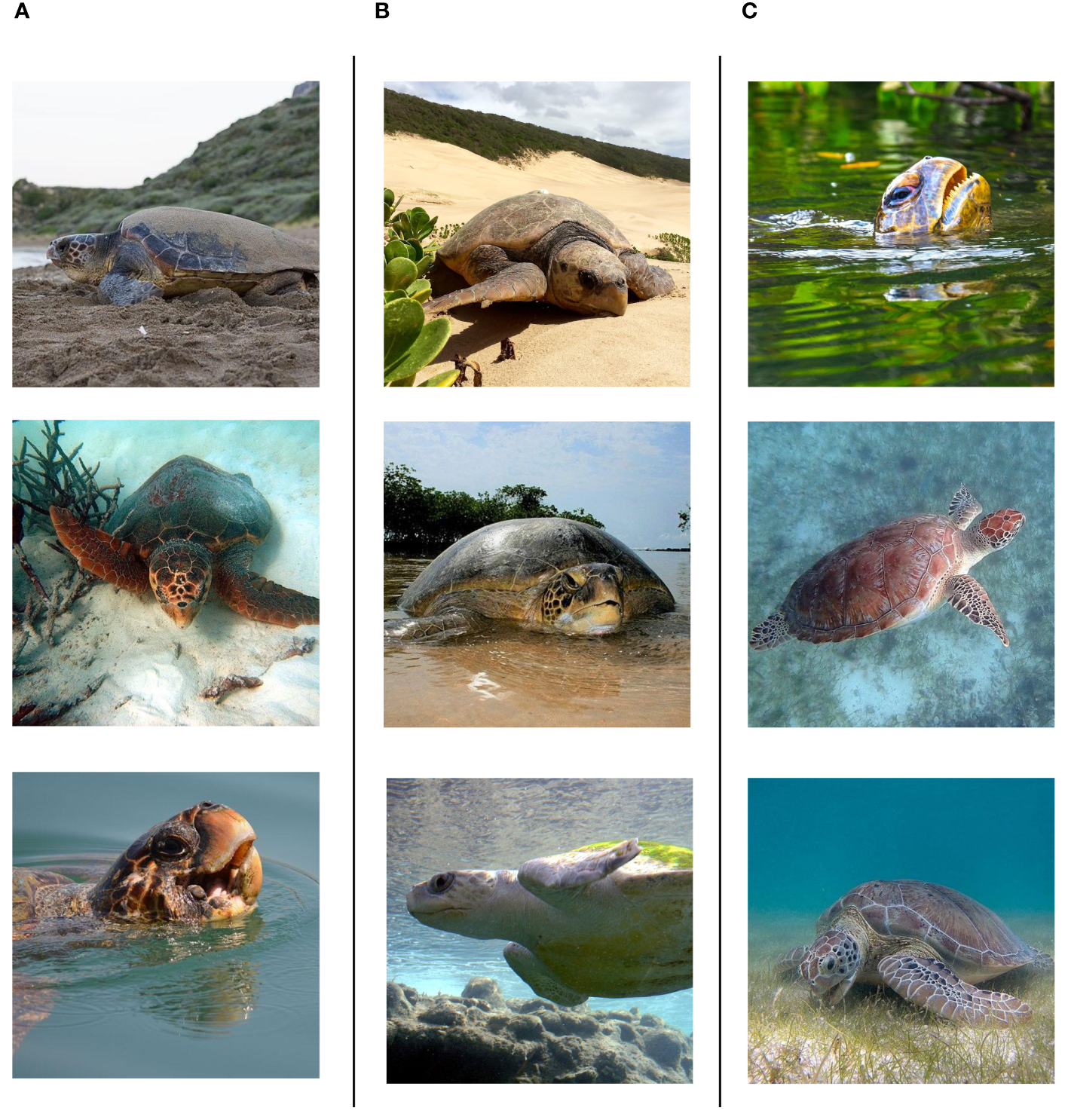 Visual stimuli. Images of three hard-shelled turtle species found in the temperate and sub-tropical northeast Pacific. Column (A) loggerhead sea turtle (Caretta caretta); Column (C) olive Ridley (Lepidochelys olivacea); Column (C) green turtle (Chelonia mydas). Images of each species were reviewed separately during the interviews. All images from Wikimedia Commons - CC-BY.
