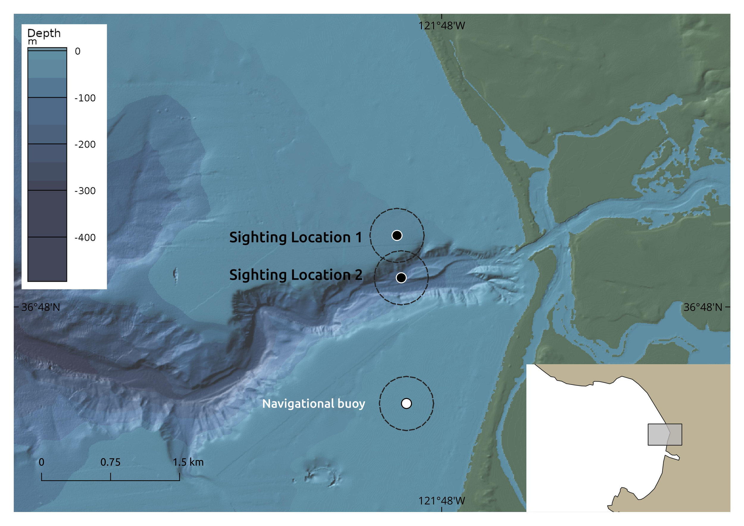 The locations of loggerhead (Caretta caretta) sighting reported on July 9, 2023 in Monterey Bay, along with the location of a navigational buoy used as a spatial reference and high-resolution (10m) bathymetry of Monterey Canyon (Paull and Caress, 2019). Dashed lines show 500m bounding for uncertainty. Map created with GeoMapApp - CC-BY.