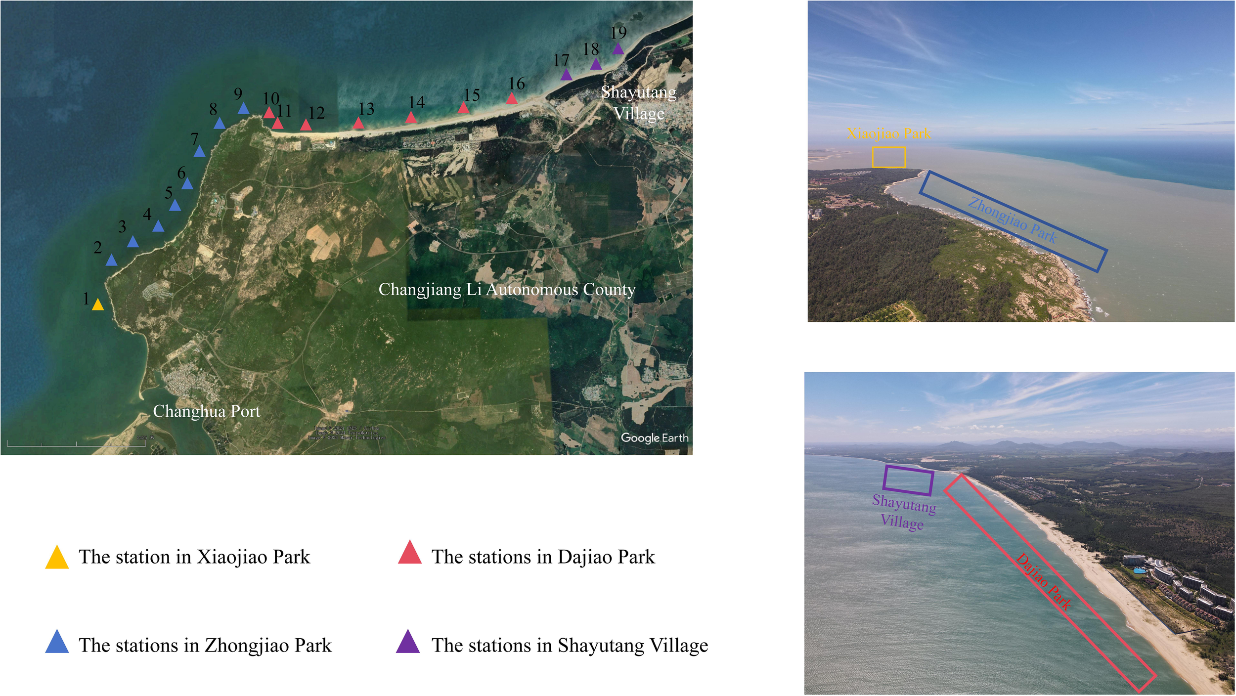 QZW is off the west coast of Hainan Island. Figure 1 shows that the sampling stations of QZW belonged to four regions, i.e., Xiaojiao Park (Station 1), Zhongjiao Park (Stations 2–9), Dajiao Park (Stations 10–16), and Shayutang Village (Stations 17–19). Xiaojiao Park is near Changhua Port and is an area with significant human activities. Zhongjiao Park is on the west side of QZW and has received protection in recent years. Dajiao Park is on the north side of QZW. It is a tourist destination, and popular activities include swimming and fishing. Shayutang Village is on the east side of QZW. It has fewer visitors than Dajiao Park, and the scenic areas are mostly the sandy beaches along the shore.