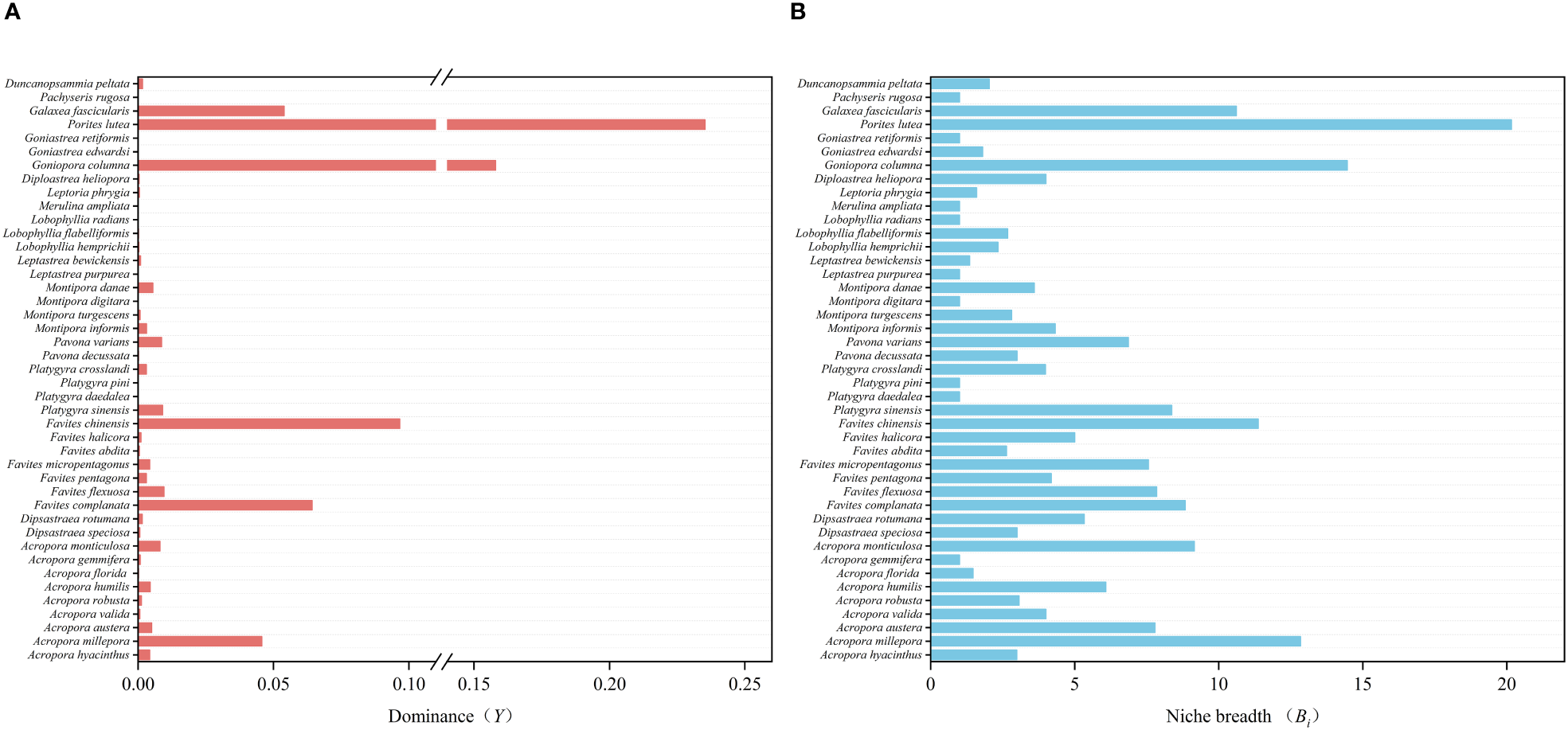 Analysis of coral communities. (A) Dominance: Dominance index of coral species, indicating the most prevalent species in the community. (B) Ecological Niche: Analysis of the ecological niches occupied by different coral species, illustrating their functional roles within the ecosystem.