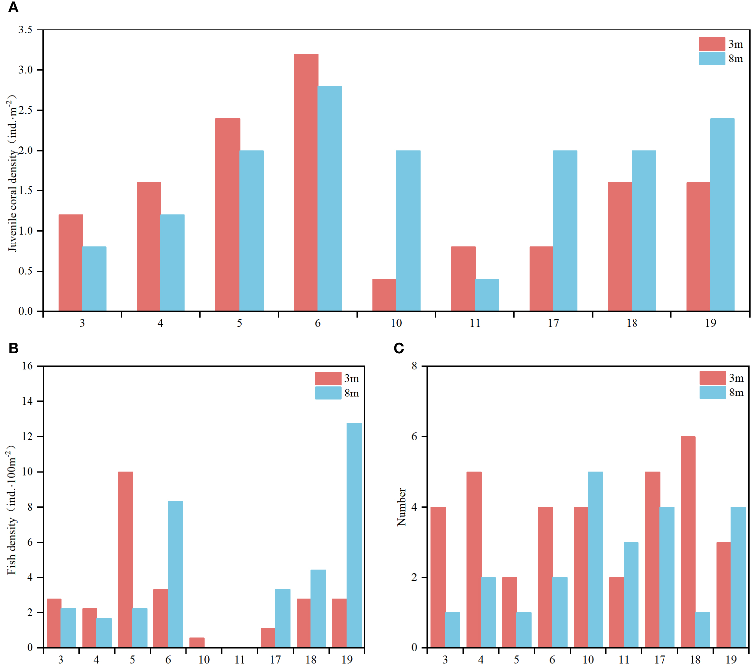 Due to the constraints outlined previously, the examination of juvenile corals, fish communities, and benthic organisms was confined to stations characterized by higher coral coverage (Stations 3-6, 10, 11, 17-19). Analysis of the findings reveals notable disparities across these stations and depths. In Figure 4A, coral recruitment displayed considerable variability across stations and depths. Station 6 exhibited the highest recruitment, with 3.2 ind.·m−2 at 3 m depth and 2.8 ind.·m−2 at 8 m depth. In contrast, Station 10 recorded the lowest recruitment at 3 m depth (0.4 ind.·m−2), while Station 11 had the lowest recruitment at 8 m depth (0.4 ind.·m−2). This indicates spatial variability in coral recruitment, possibly influenced by local environmental conditions. Primary coral recruitment was attributed to Porites and Goniopora, with supplementary recruitment from Acropora. This underscores the importance of these coral genera in facilitating reef recovery and resilience. Figure 4B highlights variations in fish density across stations and depths. At 3 m depth, the highest fish density was observed at Station 6 (3.33 ind.·100m−2), while Station 11 recorded no fish. Similarly, at 8 m depth, Station 19 exhibited the highest density (12.78 ind.·100m−2), whereas both Stations 10 and 11 had the lowest density (0.40 ind.·100m−2). These findings suggest a heterogeneous distribution of fish populations, likely influenced by factors such as habitat complexity and resource availability. Figure 4C depicts the abundance of macrobenthic organisms, with Station 18 recording the highest count (6 species) at 3 m depth and Station 10 recording the highest count (5 species) at 8 m depth. This indicates variability in benthic community composition.