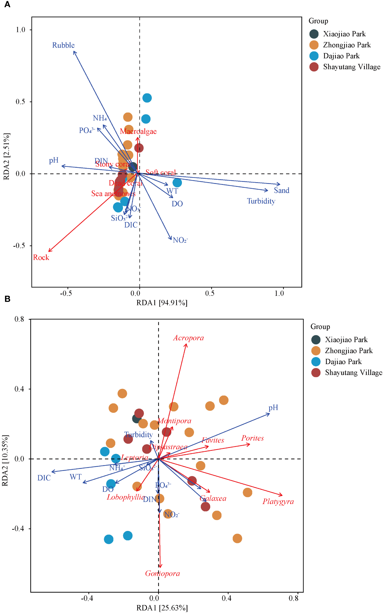 Additionally, as shown in Figure 5B, the first and second RDA axes explained 25.63% and 10.35% of the variance in coral community composition, respectively. Significant influences on coral communities were attributed to pH (P = 0.010) and DIC (P = 0.029). This suggests that variations in seawater pH and the carbonate system play important roles in the health and distribution of coral communities.