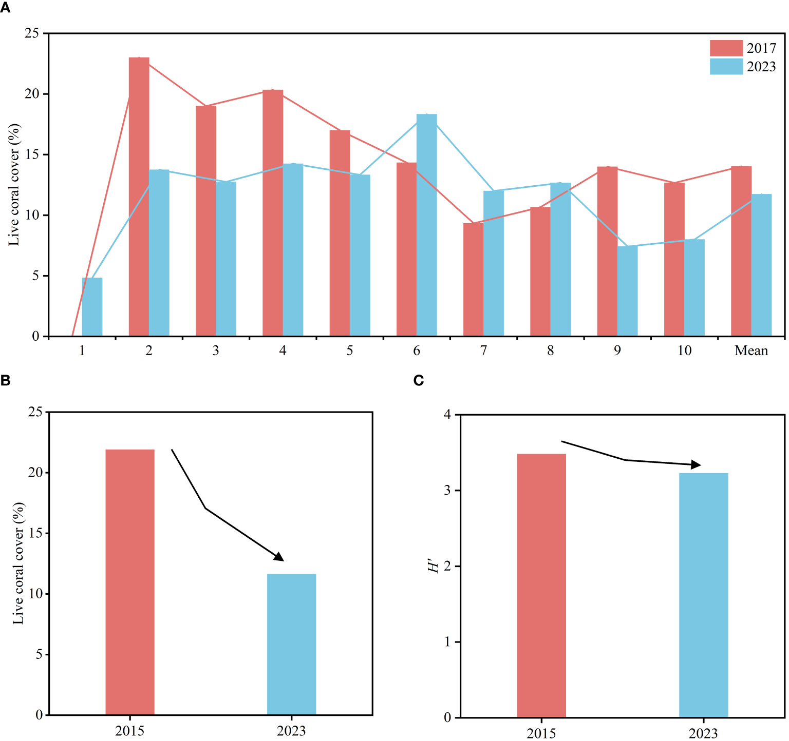 Ecological changes in Qiziwan National Marine Park. (A) Changes in Coral Coverage at Stations 1-10 from 2017 to 2023: Temporal trends in coral coverage, highlighting areas of growth or decline. (B) Change in Coral Coverage at Shayutang Village from 2015 to 2023: Long-term changes in coral coverage at a specific village site. (C)H’ of Coral Species at Shayutang Village: Variation in species diversity over time, indicating ecological stability or shifts.