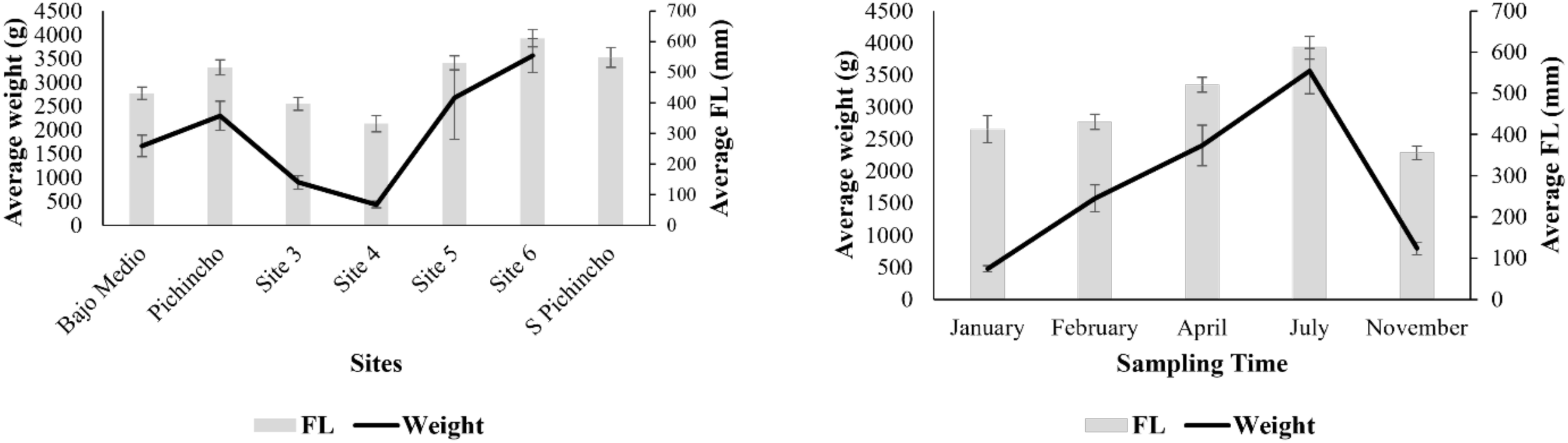 Average weight (g) and fork length (mm) of Etelis oculatus landed at the locations (left) and different sampling times (right) in the western side of Puerto Rico. Bars denote standard errors.