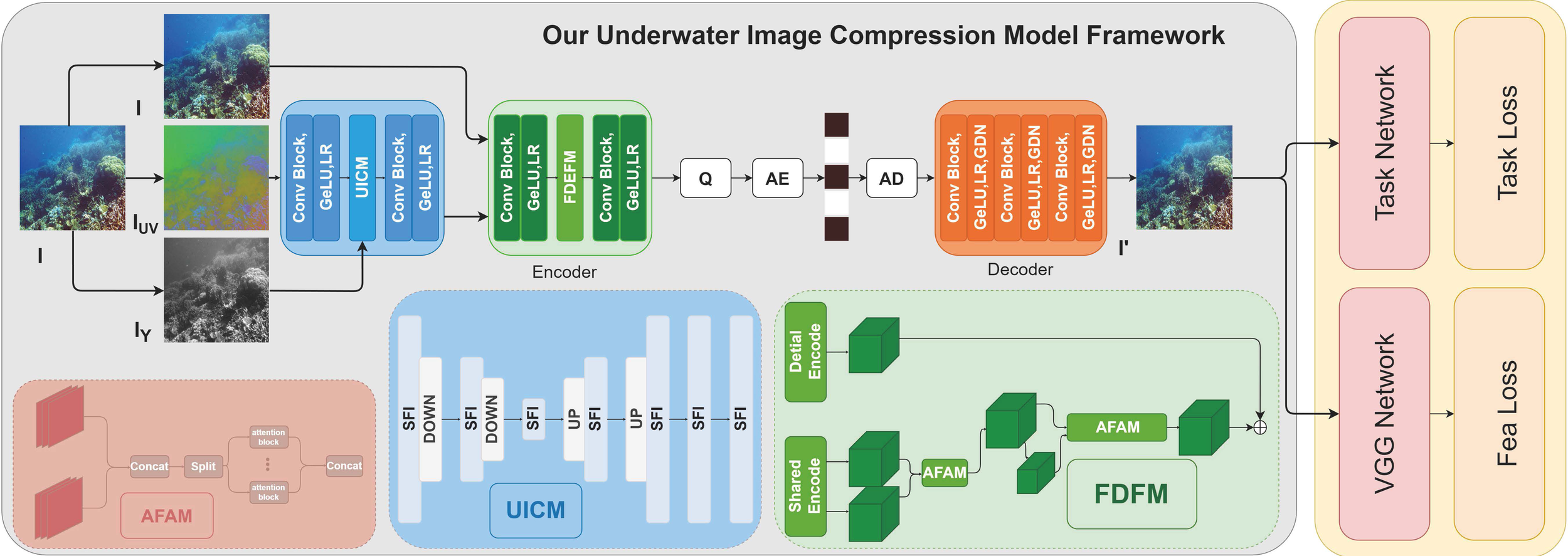 The details of the method we proposed. UICM, FDFM, AFAM respectively represent the feature recovery module, feature decomposition fusion module, and attention feature aggregation module, respectively. Q, AE and AD indicate quantization, arithmetic encoding and arithmetic decoding respectively. and represent the luminance and chrominance components of the image in the YCbCr color space.