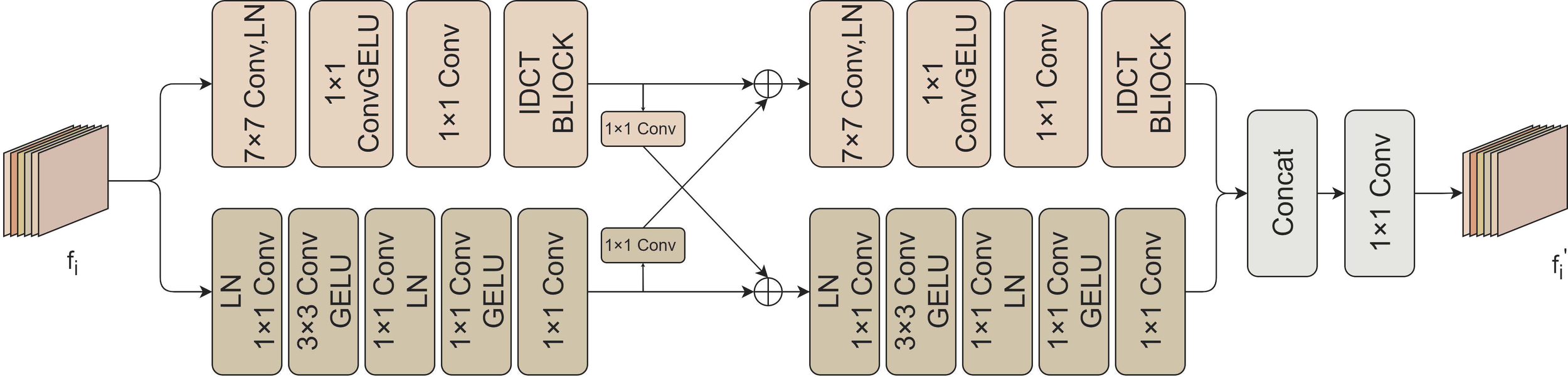 UICM employs frequency-space interaction blocks (FSI) as illustrated in Figure 3 as fundamental units. The FSI block consists of a frequency branch and a spatial branch to learn global and local information, respectively. The frequency domain representation emphasizes global attributes, while the local attributes are learned in the spatial branch. These two branches interact to obtain complementary information. The frequency branch estimates the spectrum loss in the DCT space via the CNN block and then converts it to the color space through block-IDCT. Block-IDCT uses a predefined convolutional layer with weights fixed as the D−1 coefficient. The spatial branch processes information in the spatial domain through convolutional blocks. We then interweave features from the spatial and frequency branches, facilitating the acquisition of more information by different branches. The FSI will then repeat the same calculation once more. Finally, we merge the outputs of the two branches using 1×1 convolution to obtain the output of the FSI block.