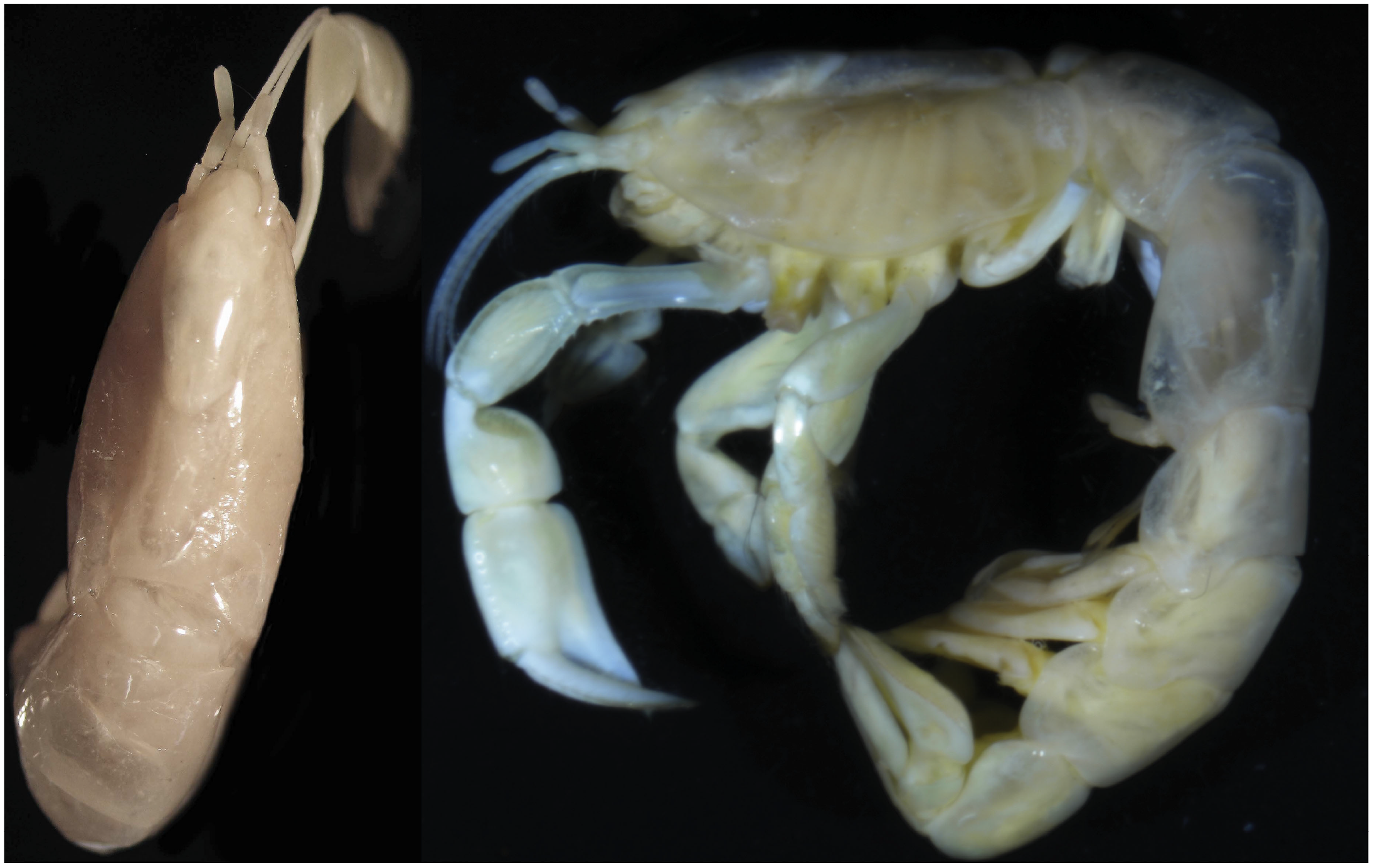 In the latter shape of the telson, uropods, and chelipeds and the presence of a rudimentary epipod on maxilliped 3, V. beervana is more similar to Bathycalliax geomar from the eastern Pacific, but the new species lacks cardiac sulci of the carapace (present in B. geomar) and has an arthrobranch on maxilliped 2 (absent in B. geomar) and the eyestalks are anterolaterally convex (subtriangular in B. geomar). The first male pleopod is uniquely flagellate in B. geomar, whereas, in both V. arutyunovi and V. beervana, the first pleopods are vestigial; however, only small males are available for both species of Vulcanocalliax and the adult form of the first male pleopod might yet be unknown.
