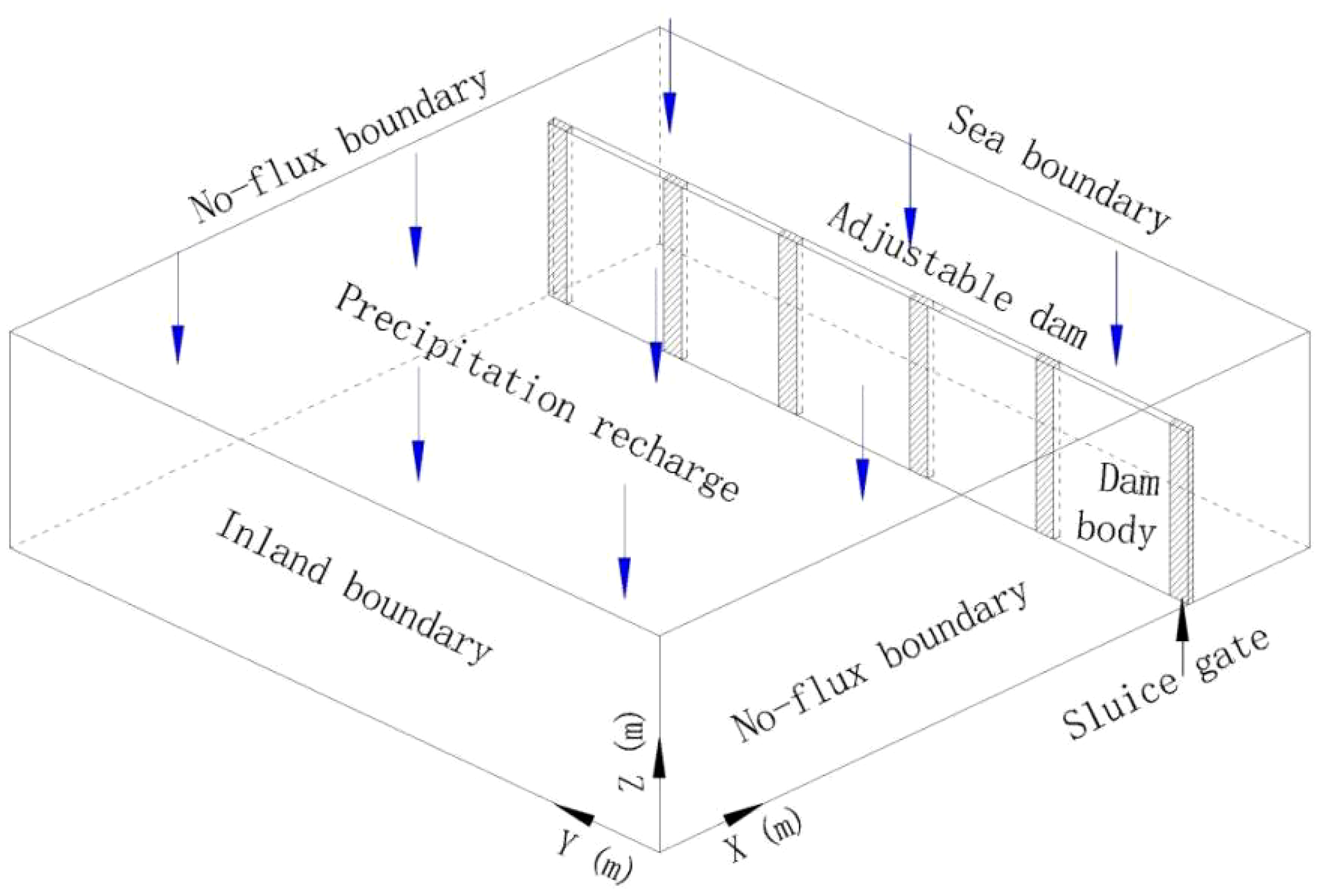 Unlike the subsurface dam and cutoff wall, the subsurface permeable reactive barrier employs vertical openings to facilitate the flow of contaminant plumes through the reactive media (Figure 1A) (Blowes et al., 2000). Similarly, gated storm surge barriers, designed to mitigate coastal flood hazards during extreme storms, incorporate vertical auxiliary lift gates that are only closed during coastal flooding events (Figure 1B) (Orton et al., 2023). Inspired by the designs of subsurface permeable reactive barriers and gated storm surge barriers, we propose a novel subsurface adjustable dam consisting of high underground dam bodies and adjustable vertical sluice gates (Figure 2). The sluice gates are integrated within the dam bodies, mimicking the structure of storm surge barriers with auxiliary lift gates (Figure 1B). Groundwater discharge is controlled by the sluice openings, which can be opened or closed in response to dynamic variations in precipitation. During the dry periods, the sluice gates are closed to conserve groundwater resources and prevent active SWI. Conversely, during the wet periods, the sluice gates can be opened to discharge the residual saltwater upstream the dam seawards. This novel subsurface adjustable dam enables flexible desalination of coastal aquifers during the wet periods and effective prevention of active SWI during the dry periods on an annual basis.