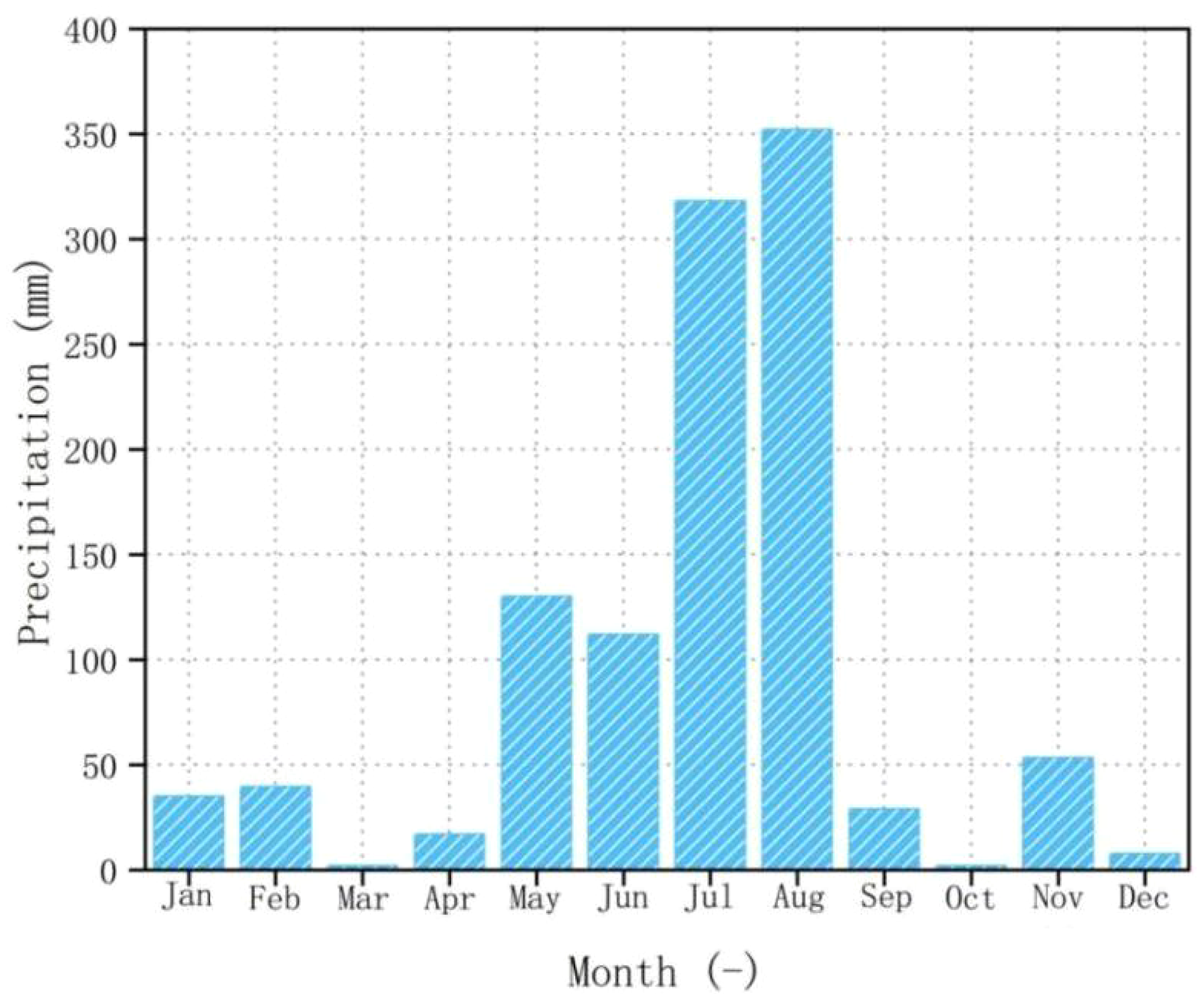 SEAWAT has been widely used to simulate the seawater intrusion process (Guo and Langevin, 2002). A three-dimensional hypothetical model domain (Figure 2) was used to represent the coastal unconfined aquifer (1000 m × 1000 m × 10 m). The aquifer was assumed to be horizontal, homogeneous, and isotropic. The field-scale model domain was discretized into 10 m × 10 m × 1 m elements. Dirichlet boundary conditions were applied to both the inland and seawater boundaries, with constant heads of 8 m and 9 m, to create the condition of active seawater intrusion. Constant concentrations of 35 g/L and 0 g/L were assigned to the sea and inland boundaries, respectively. The top boundary was defined as a Neumann boundary, with the precipitation recharge. No-flow boundary conditions were applied to all other boundaries. Constant monthly precipitation was used each year (Figure 3), and precipitation recharge into the aquifer was calculated using an infiltration coefficient of 0.33. The wet period was defined as July and August, when precipitation was significantly higher, while the dry period was defined as September to next June. For simplicity, evaporation was neglected.