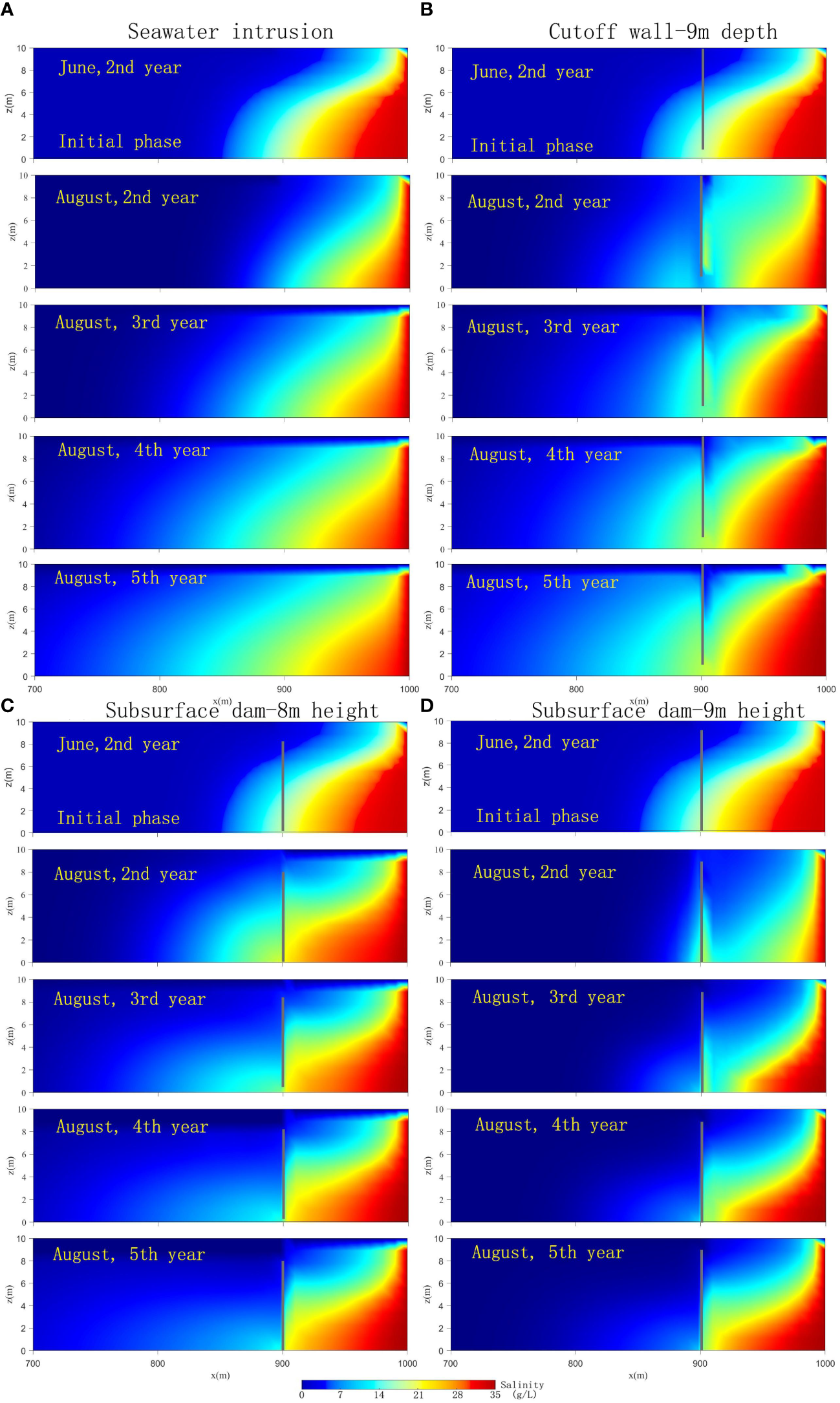 Cross-section of the dynamic salinity distribution in the (A) SWI, (B) cutoff wall (9 m-depth), (C) subsurface dam (8 m-height), and (D) subsurface dam (9 m-height) scenarios on an annual basis.