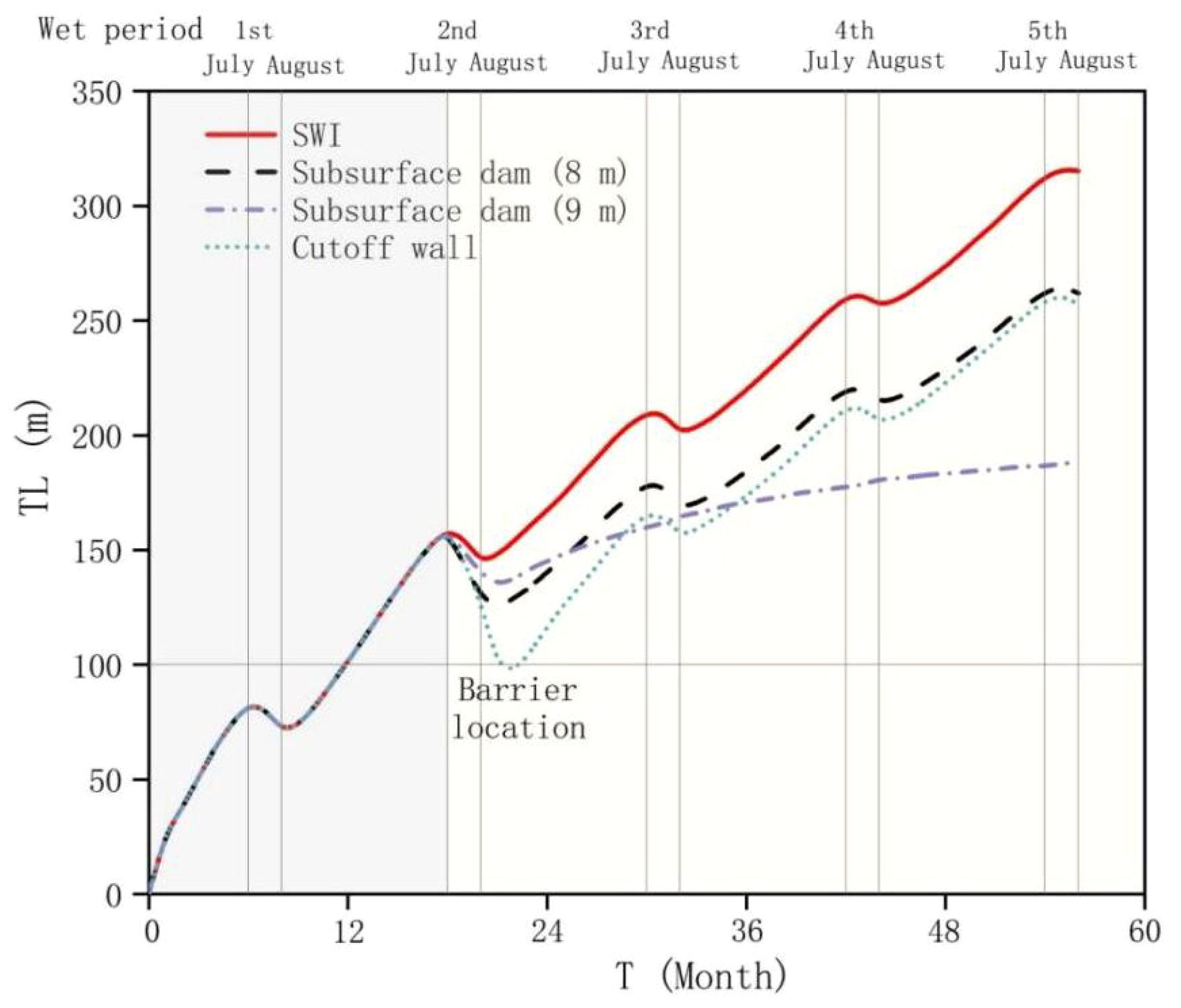 In summary, the traditional subsurface physical barriers (cutoff wall and subsurface dam) are ineffective in preventing active seawater intrusion and desalinating the residual saltwater. In contrast, the subsurface adjustable dam can not only prevent the seawater from intruding inland during the dry periods but also remove the residual saltwater trapped upstream the dam during the wet periods.