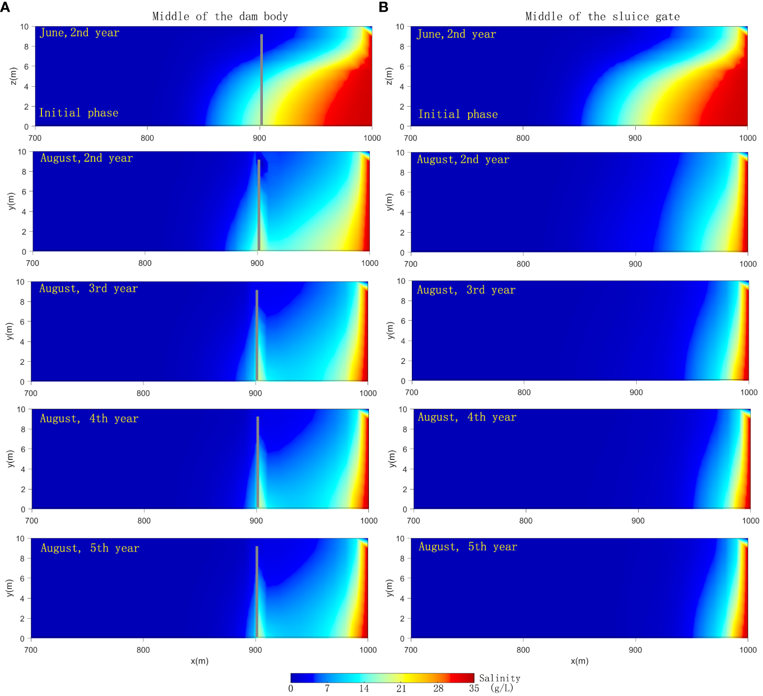 Cross-section of the salinity distribution at the (A) the middle of the dam body and (B) the middle of the sluice gate in the adjustable dam scenario on an annual basis.