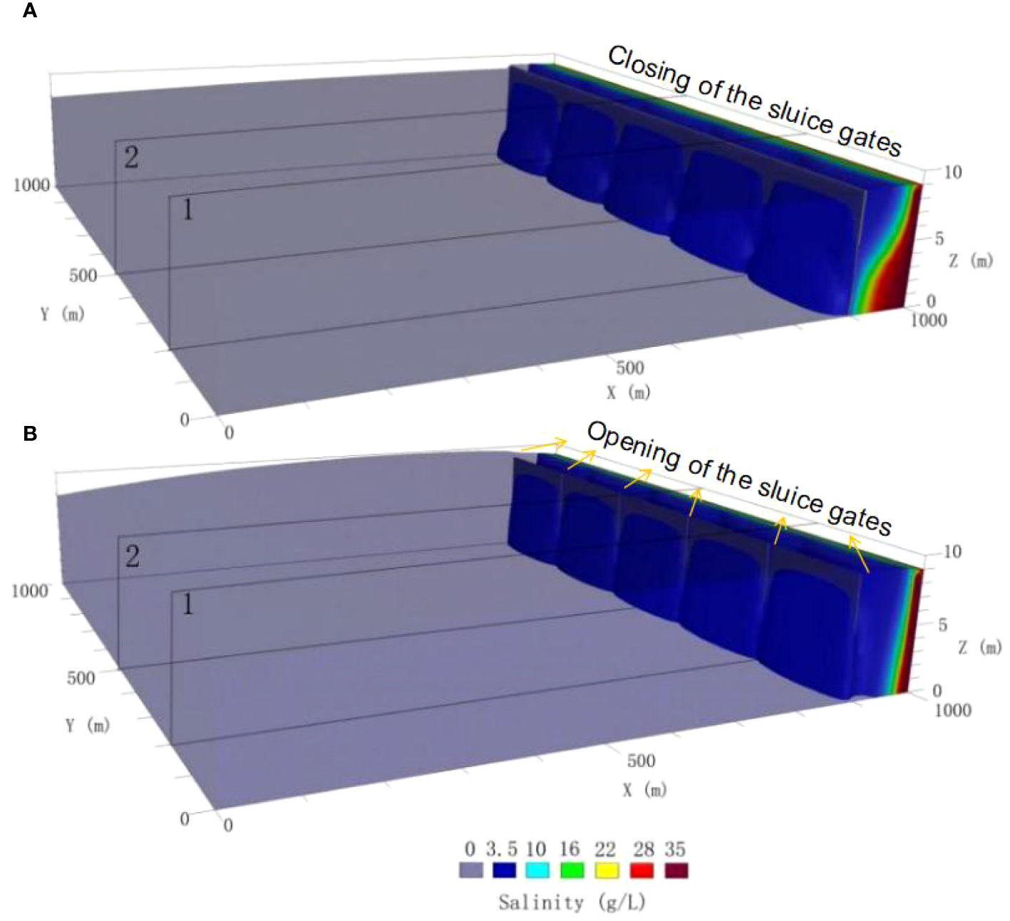 Three-dimensional salinity distribution in the adjustable dam scenario at the (A) 54th month (June, 5th year, dry period) and (B) 56th month (August, 5th year, wet period). The gray block represents the adjustable dam. The cross section 1 locates the middle of the sluice gate, and the cross section 2 locates the middle of the dam body.