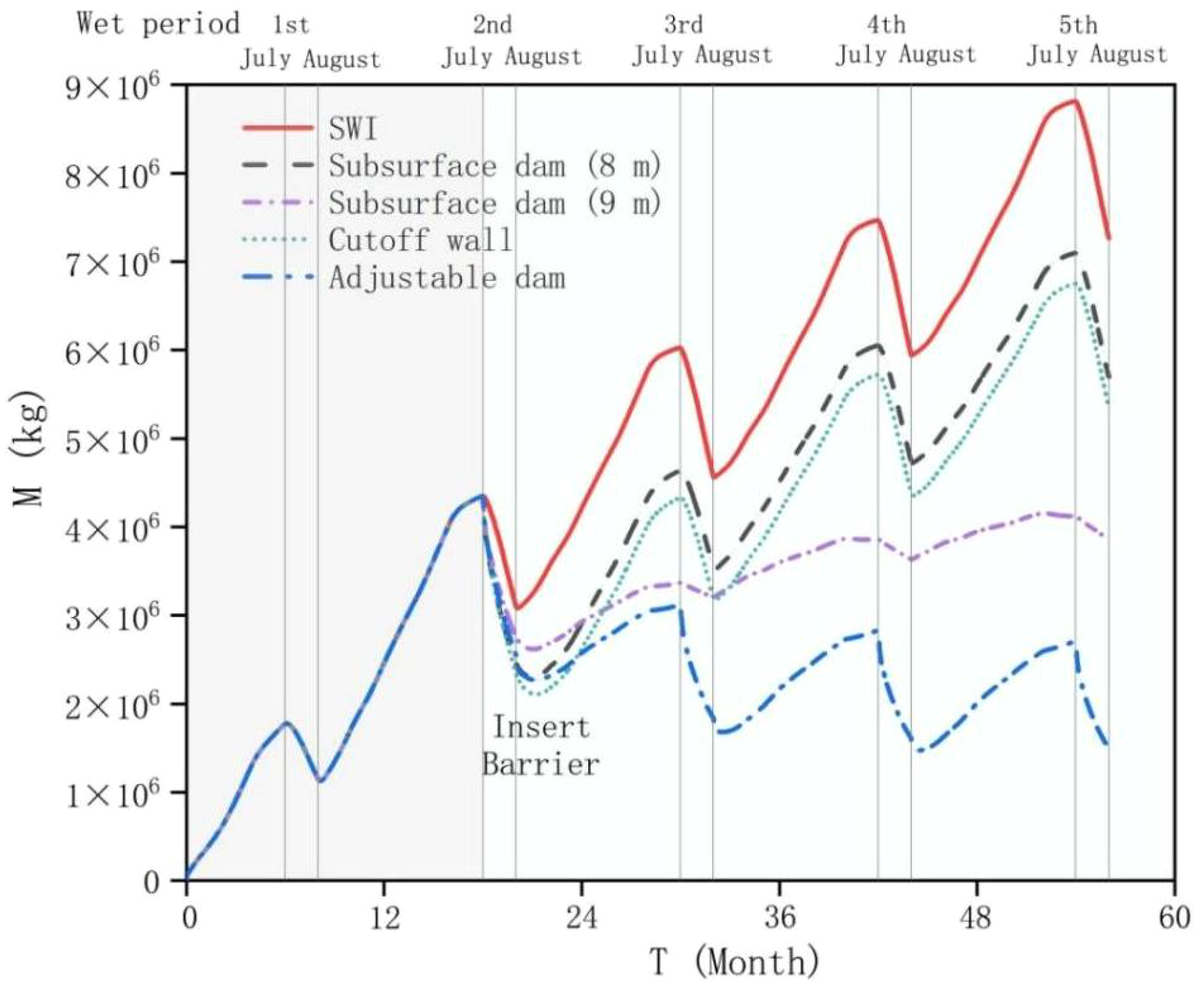 Compared to the SWI scenario, all the subsurface physical barriers could reduce the salt mass (M) to varying degrees throughout the simulation period. However, the overall trend of M in the SWI, cutoff wall, and subsurface dam scenarios increase each year, despite temporary decrease during the wet periods (July and August). The M values in the 9 m-depth cutoff wall and 8 m-height subsurface dam scenarios are similar and slightly lower than that in the SWI case. In contrast, M in the 9 m-height subsurface dam scenario increases mildly and is significantly lower than that in the SWI case. These results indicate that the traditional physical barriers temporarily reduce the saltwater during the wet periods, but this reduction is offset by increased seawater intrusion during the next dry periods. Conversely, the overall trend of M in the subsurface adjustable dam scenario gradually decreases each year. This is because the residual saltwater upstream the adjustable dam is gradually removed when the sluice gates are open during the wet periods, meanwhile the downstream saltwater is prevented from intruding inland during the dry periods by the closed sluice gates.