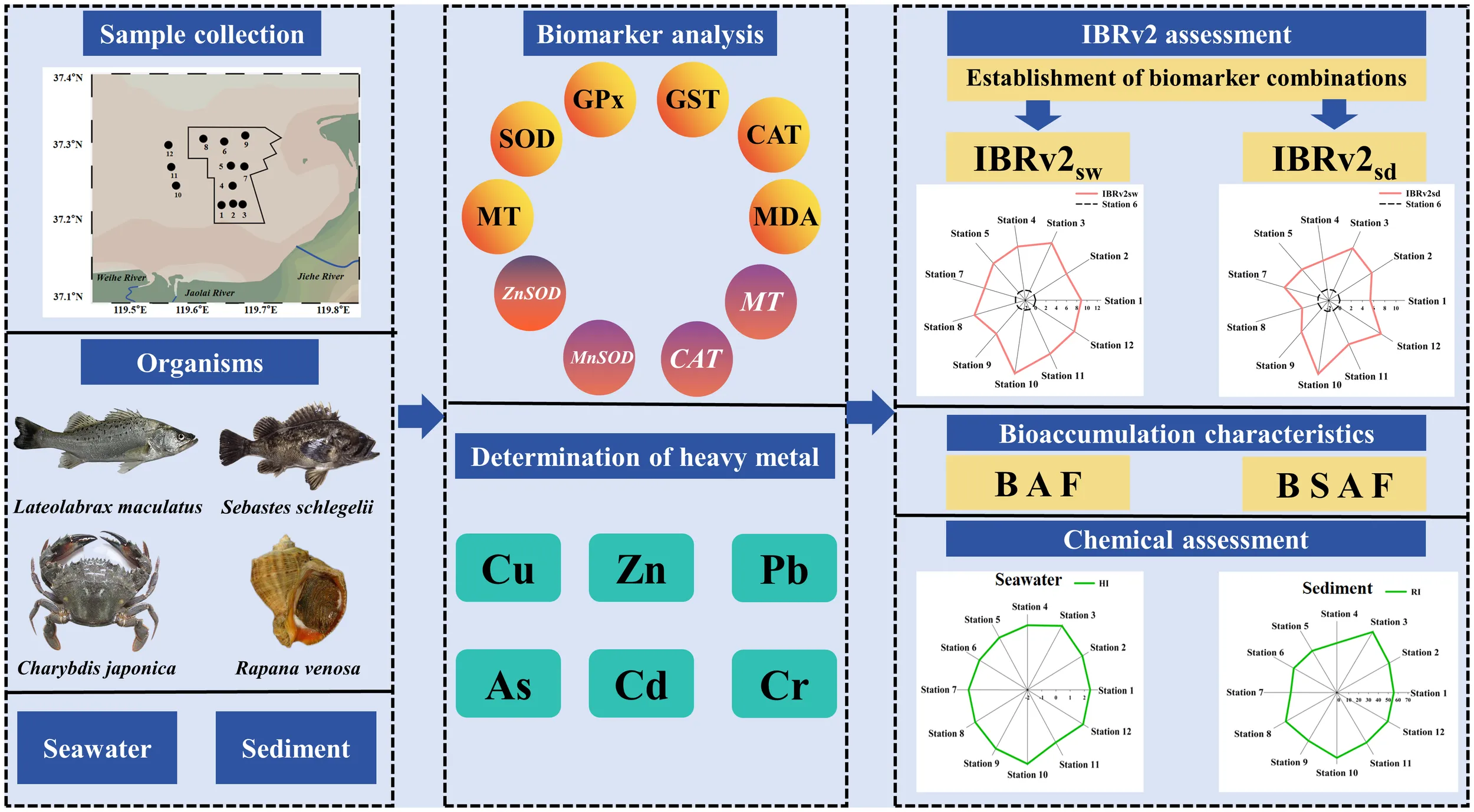 Understanding the impact of marine ranching construction on the marine environment is essential for the sustainable development of marine ranching. Environmental monitoring, especially in view of the effect of pollution on organisms, is crucial for the management of marine ranching areas. However, the biomarker approach had not yet been applied to environmental assessment of marine ranching prior to our study.