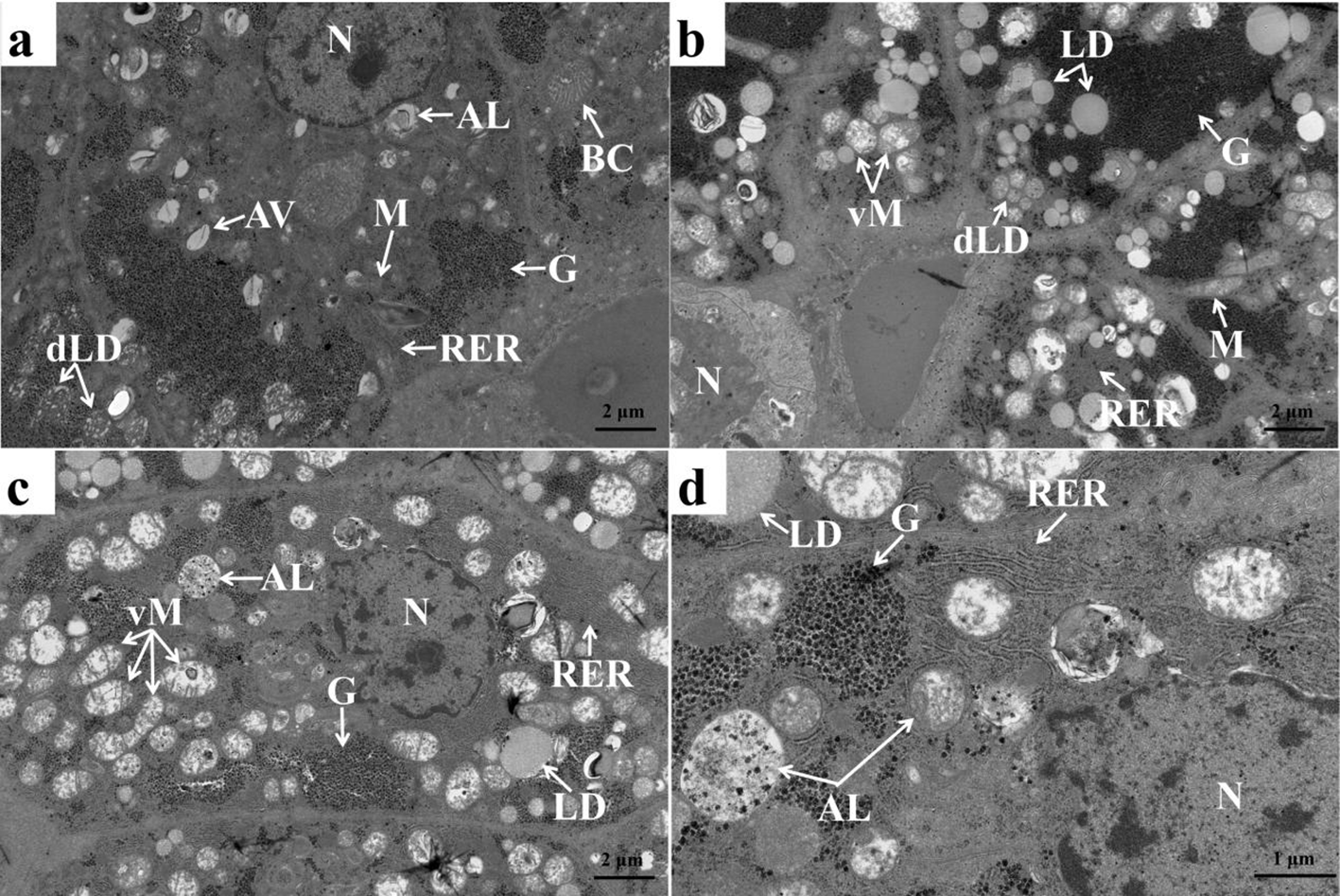 Ultrastructure of the liver of juvenile Cyprinus carpio in diet 1 and diet 3. (A) Liver of juvenile Cyprinus carpio in diet 1, showing bile canaliculus (BC), mitochondria (M), autophagic vacuole (AV), autolysosome (AL), glycogen (G), nucleus (N), degradative lipid droplet (dLD), and rough endoplasmic reticulum (RER) in hepatocyte. (B–D) Liver of Cyprinus carpio in diet 3, showing increased lipid droplet (LD), vacuolated mitochondria (vM), autolysosome (AL), and rough endoplasmic reticulum (RER).