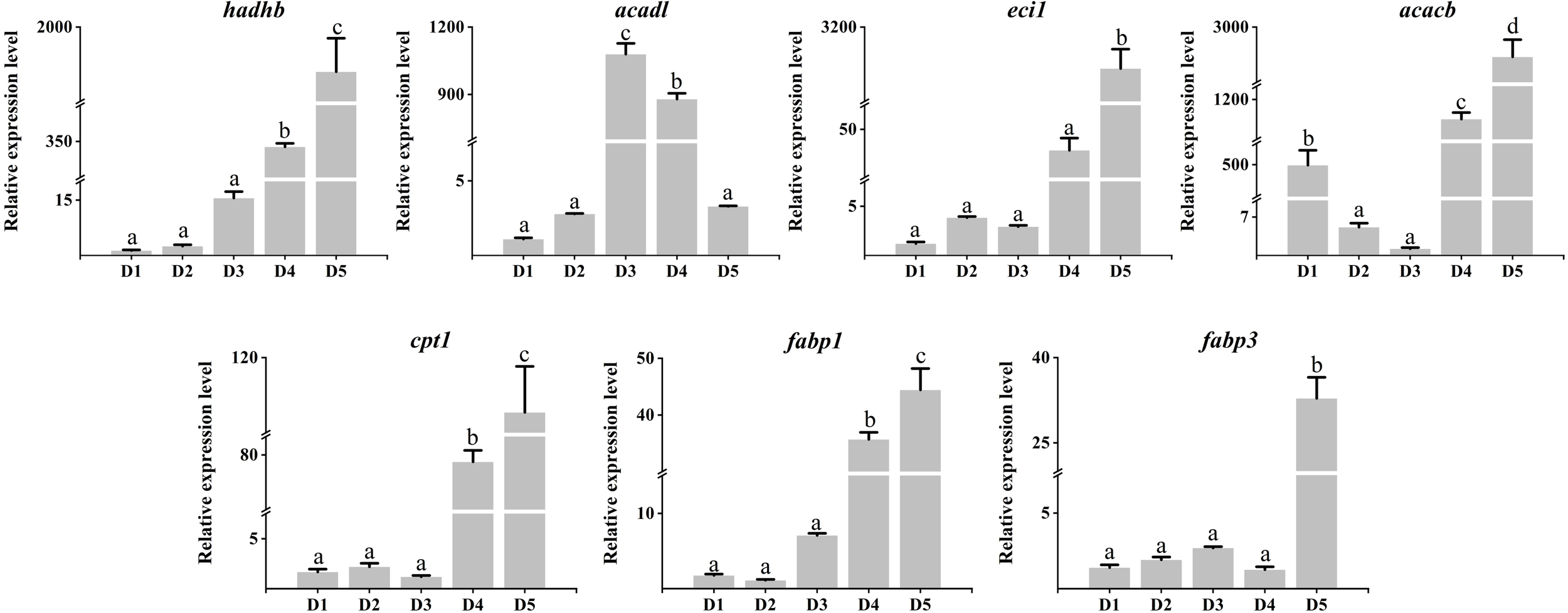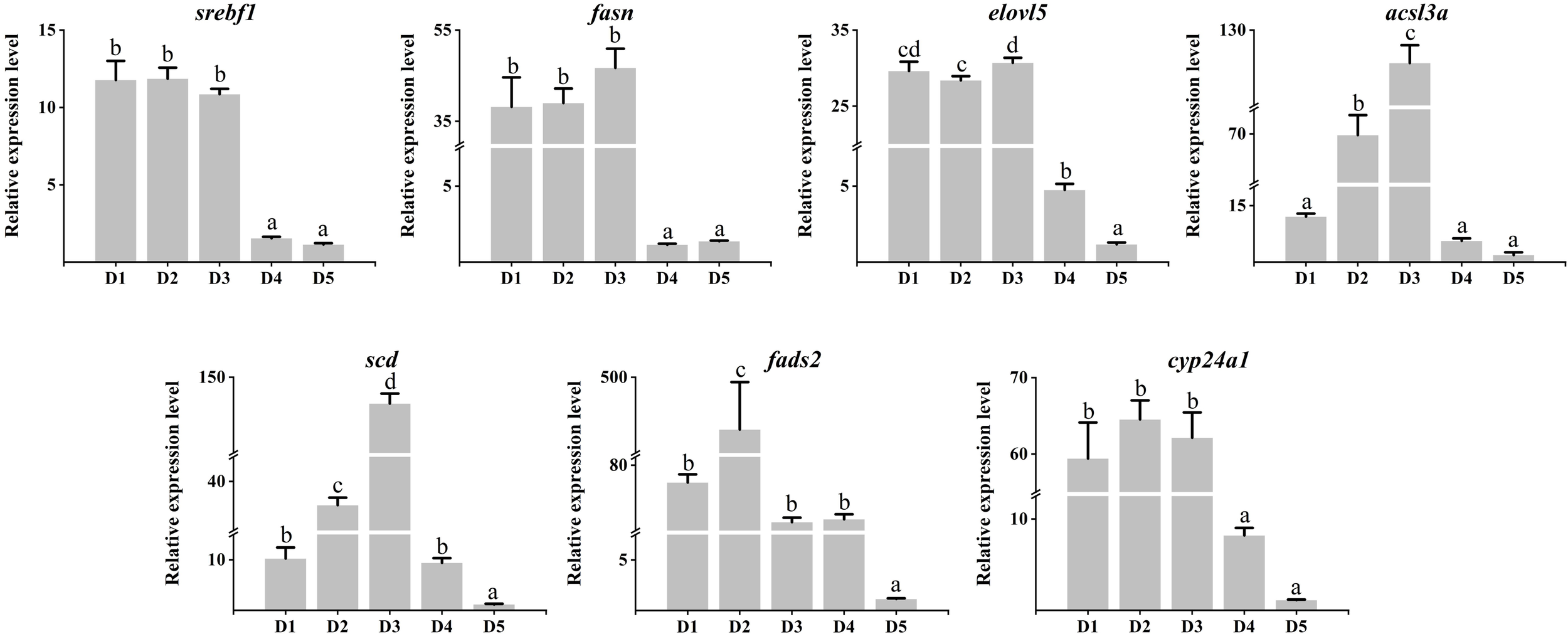 As shown in Figure 3, the mRNA expression of lipolysis-related genes such as hadhb, acacb, cpt1, and fabp1 genes were significantly up-regulated in diet 4 and Diet 5 (P < 0.05). Similarly, eci1 and fabp3 genes were only significantly up-regulated in diet 5. In addition, the acadl gene was significantly up-regulated in diet 3 and diet 4. Meanwhile, the acacb gene was significantly down-regulated in diet 3 and diet 4. As shown in Figure 4, the mRNA expression of lipogenesis-associated genes, including srebf1, fasn, elovl5, acsl3a, scd, and cyp24a1 genes were significantly down-regulated in diet 4 and diet 5 (P < 0.05). Nevertheless, acsl3a and scd genes were significantly up-regulated in diet 2 and diet 3 (P < 0.05). In addition, fads2 was only significantly up-regulated in diet 2 and down-regulated in diet 5 (P < 0.05).