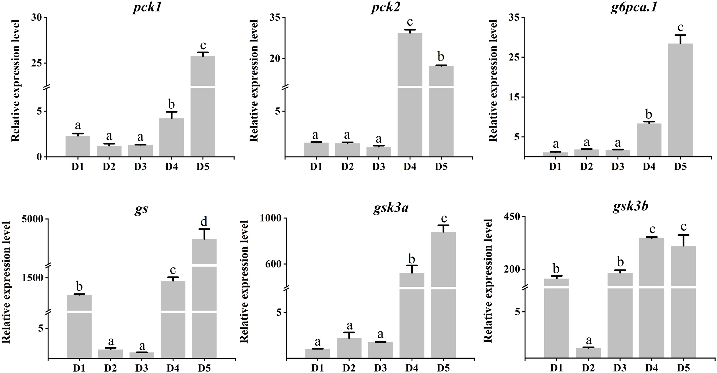 As shown in Figure 5, the mRNA expression of glycolysis genes such as hk, gk, and pk genes were significantly down-regulated in the liver of fish in diet 4 and diet 5 (P < 0.05). However, gk was significantly up-regulated in diet 3, both gk and pk were significantly up-regulated in diet 4 (P < 0.05). As shown in Figure 6, the relative expression levels of gluconeogenesis genes, including pck1, pck2, g6pca.1, gs, gsk3a, and gsk3b genes were significantly up-regulated in the liver of common carp in diet 4 and diet 5 (P < 0.05). Nevertheless, gs was significantly down-regulated in diet 2 and diet 3, and gsk3b was significantly down-regulated in diet 2 (P < 0.05).