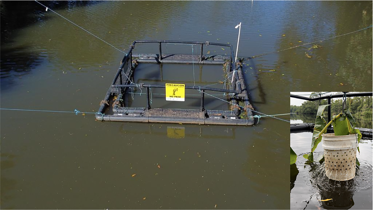 Floating cage where manatees where temporarily captured for recording (San San River, Bocas del Toro, Panama). Bucket filled with banana pulp and banana leaves used to attract the manatees (image insert).