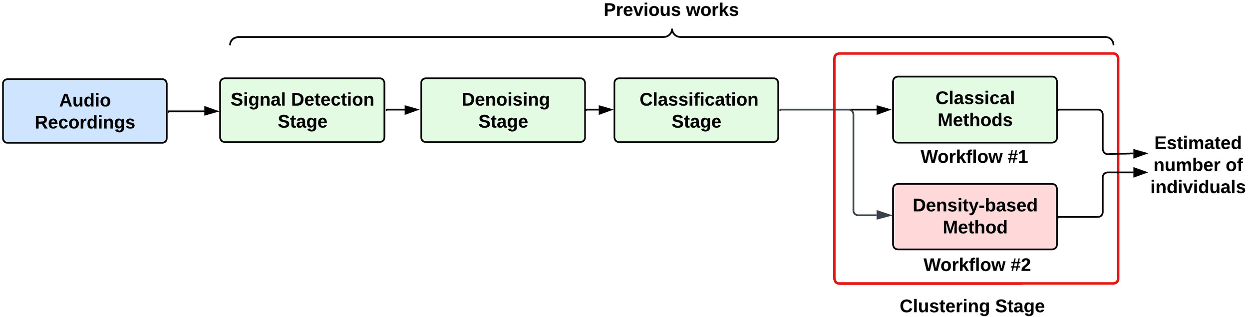 In Merchan et al. (2019), to estimate the number of individuals, the authors presented a “clustering stage” based on “classical clustering methods” such as K-means and hierarchical clustering. This approach used a STFT-based spectrograms and PCA for signal representation and dimensionality reduction, respectively. This approach will be called Workflow #1 throughout the text.
