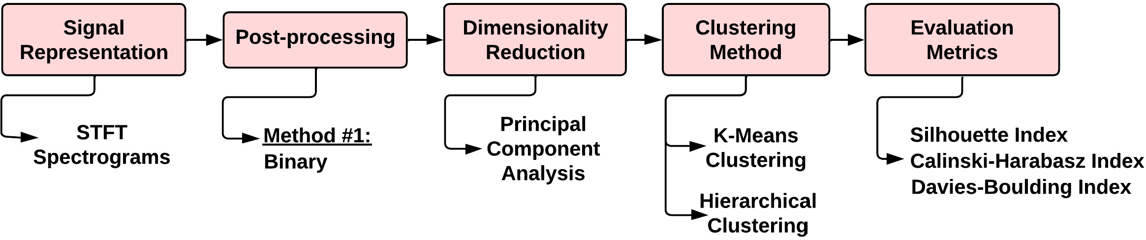 Diagram for Workflow #1. It comprises a signal representation stage using STFT spectrograms, a spectrogram post-processing stage, a dimensionality reduction stage by PCA, a clustering stage using classical methods (K-means or Hierarchical Clustering) and an Evaluation metrics stage.