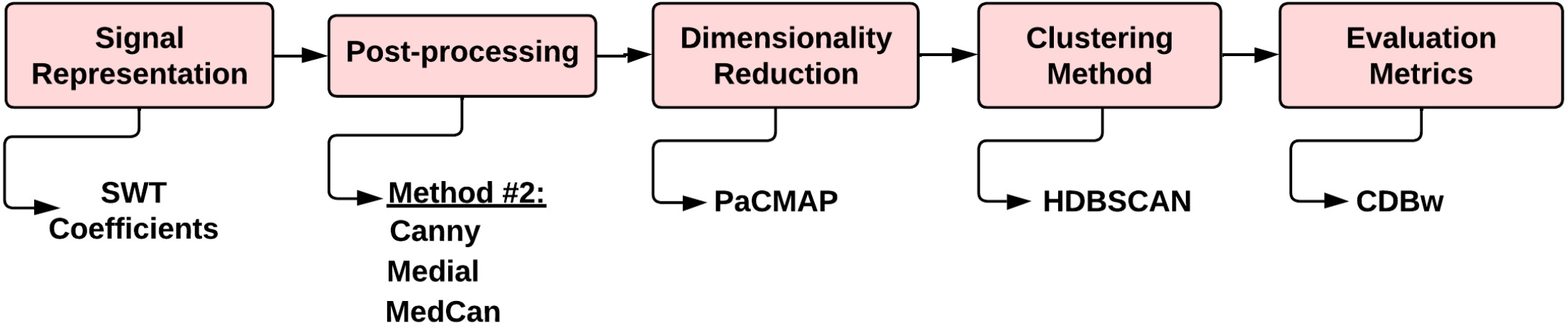 Diagram of the Workflow #2. It consist of a signal representation stage using SWT, a postprocessing stage, a dimensionality reduction stage using PacMAP, a clustering stage using HDBSCAN and an evaluation metrics stage.
