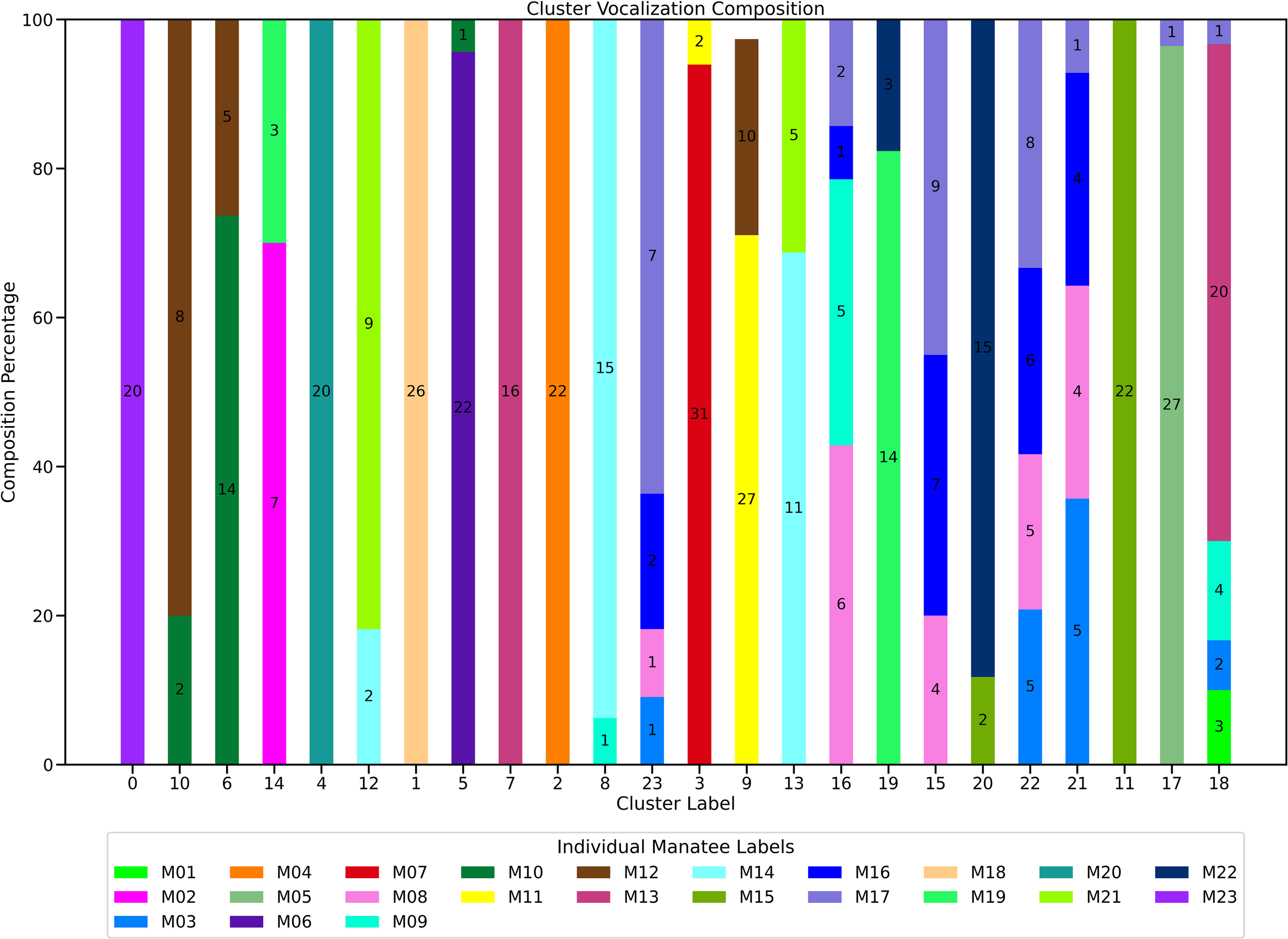 The recordings of the 23 manatees in captivity yielded 1446 vocalizations (See Table 1). In the following section, we present the scheme used to obtain the vocalizations from the recordings.