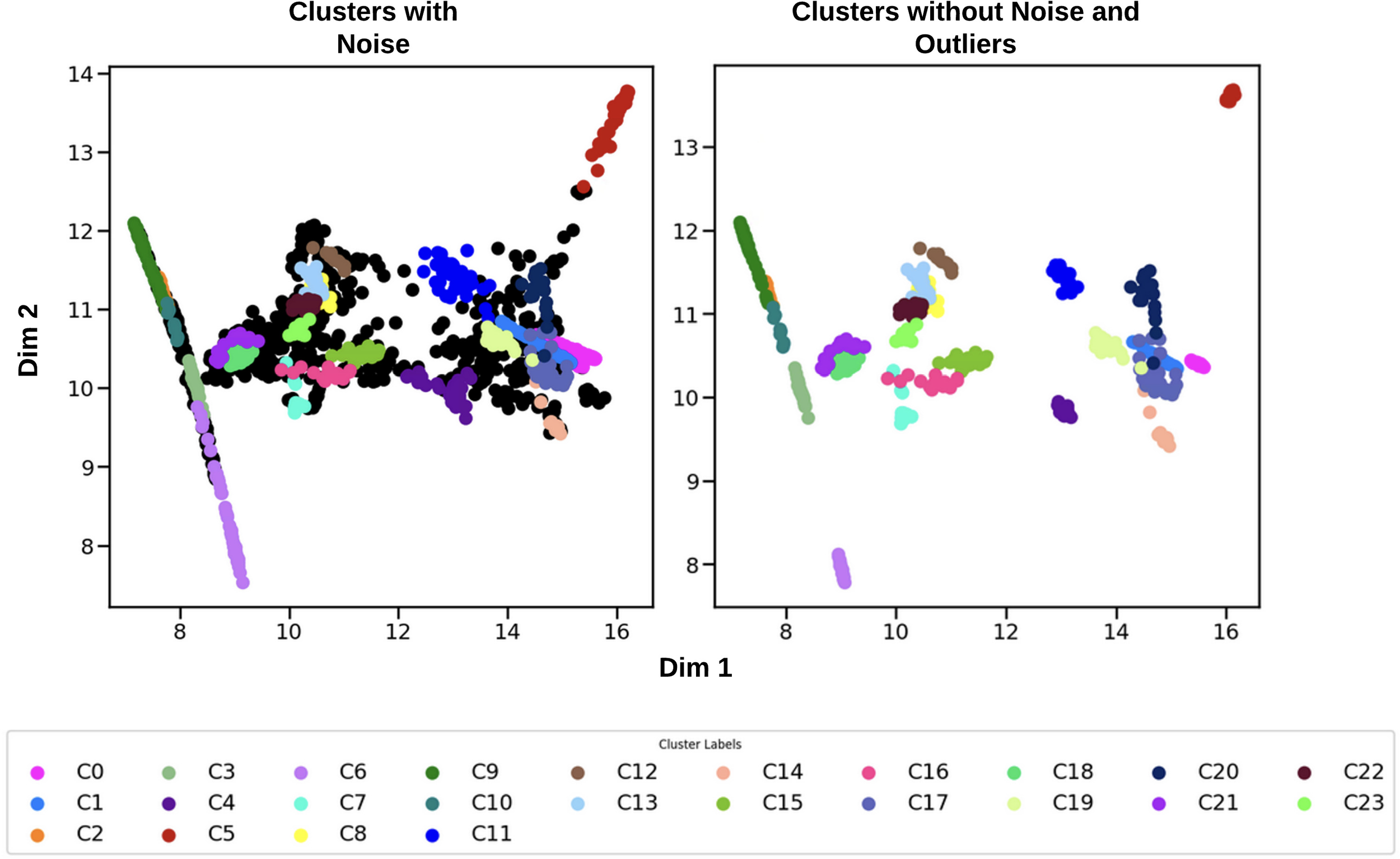 Then, a non-linear dimensionality reduction algorithm (also known as Manifold Learning) referred as PaCMAP (Pairwise Controlled Manifold Approximation) and described in (Wang et al., 2020), is used. It provides a better data representation in lower dimensions by capturing the complex data patterns inherent to manatee vocalizations without losing significant information in the process. Furthermore, to better distinguish the acoustic features of different individuals, we utilized a density-based clustering algorithm named HDBSCAN for Hierarchical Density-Based Spatial Clustering of Applications with Noise (Campello et al., 2013).