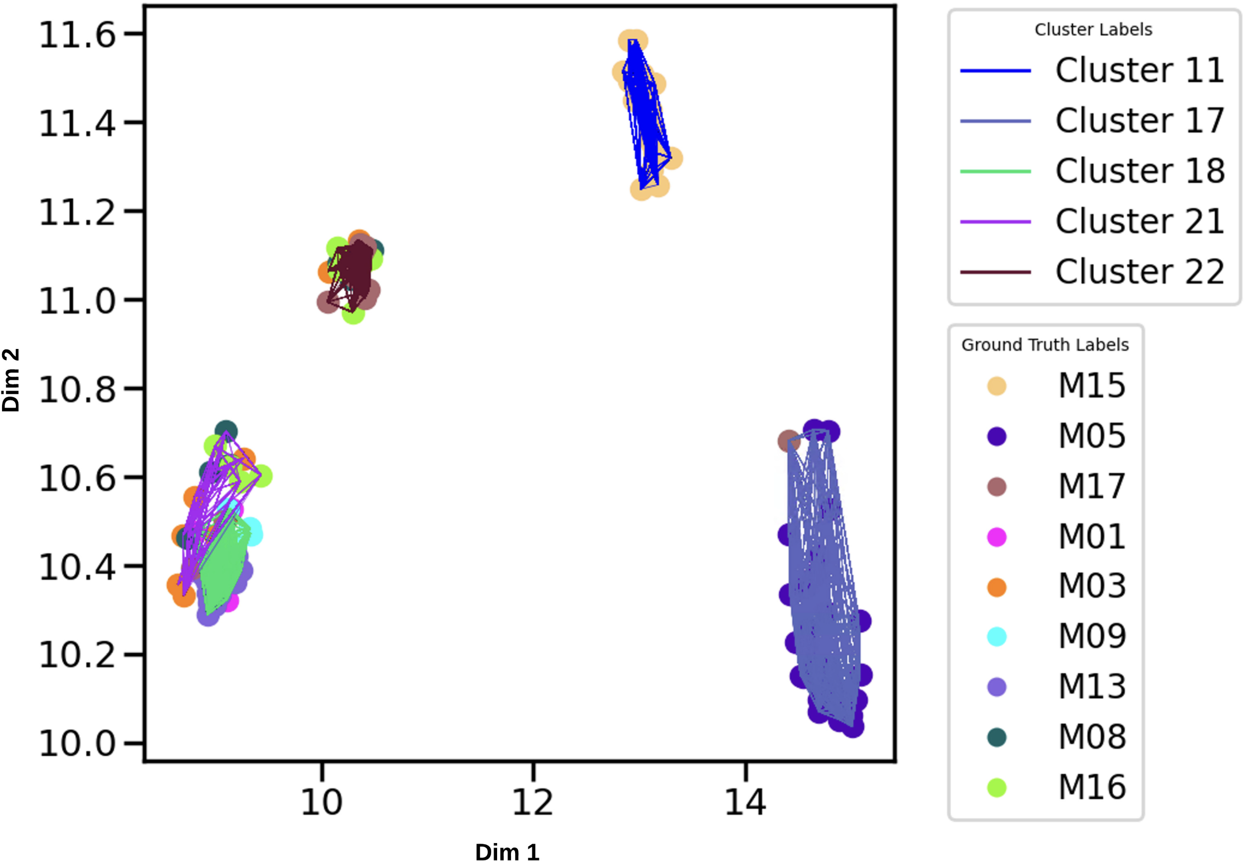 This workflow presented limitations that stemmed from its use of linear data representation through PCA and the clustering methods it employed, which posed challenges when handling data with nuanced similarities found in manatee vocalizations. Manatee vocalizations exhibit complexity, where individuals within similar demographics (such as same sex and age range) often present close fundamental frequencies and similar time-frequency contour properties. This affected the accuracy in the estimation of the number of manatees and the effective grouping of their vocalizations.