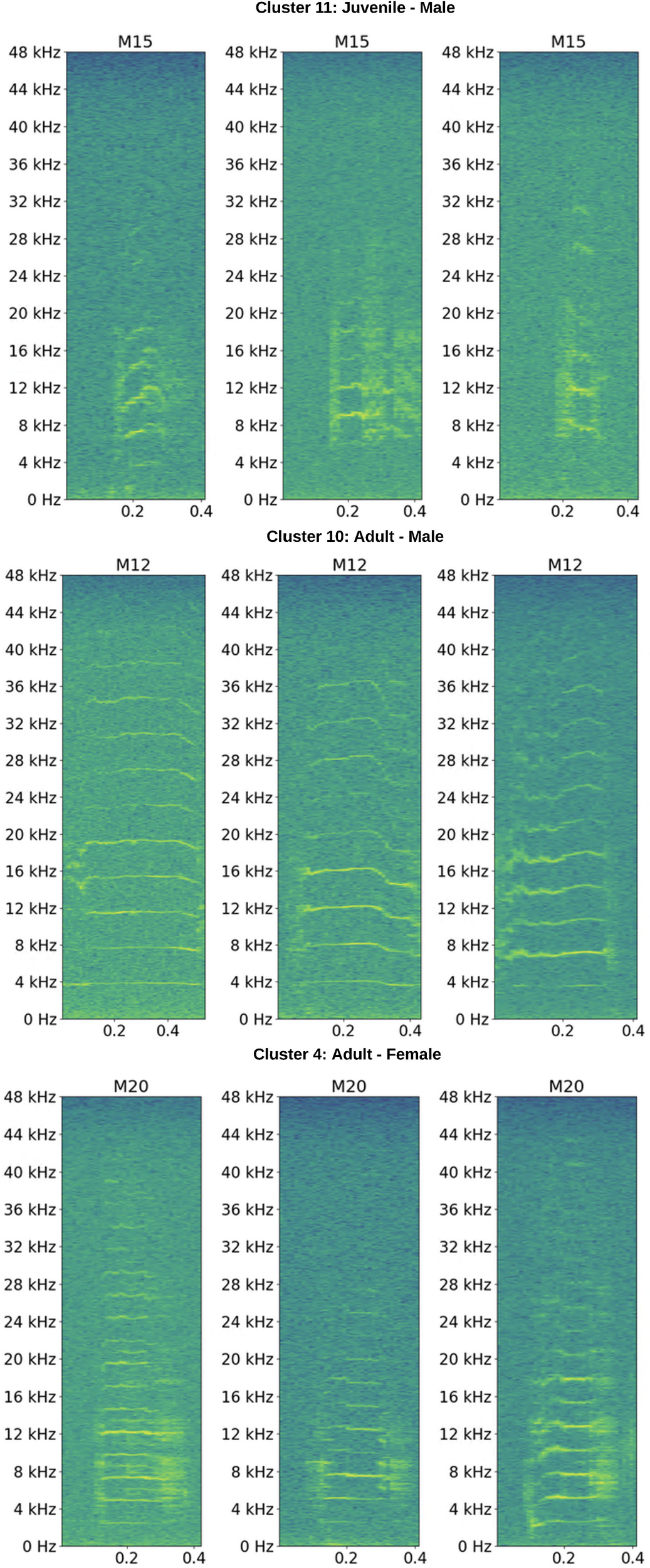Previous work, analyzing the manatee’s vocal characteristics led to an understanding of its unique properties related to demographical characteristics. This is detailed in studies conducted by Sousa-Lima et al (Sousa-Lima et al., 2002, 2008), which explored the relationship between individual age, sex and size associated with vocal pitch (also referred to as fundamental frequency) and duration, employing recorded vocalizations from 15 individual manatees. Furthermore, Umeed et al. (2018) analyzed the structure of the different classes of vocalizations and their features related to sex and age. Additionally, it is worth mentioning the recent works of Brady et al. (2022) where the acoustic contour (time-frequency variations) of two subspecies of the West Indian manatee (Trichechus inunguis and Trichechus manatus) were investigated regarding to age and size.