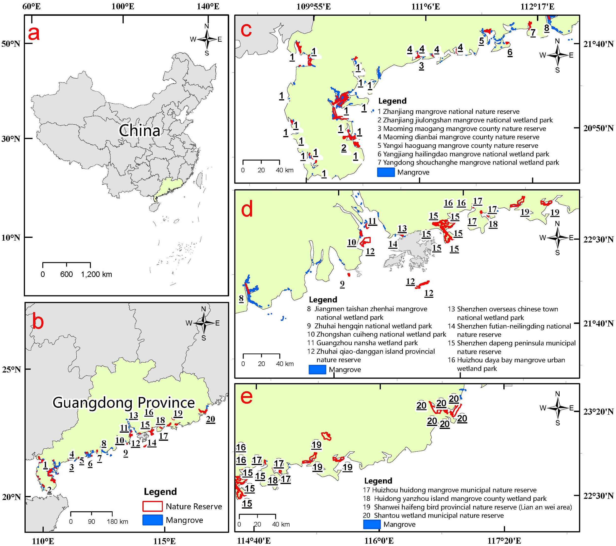 Schematic diagram of Guangdong Province, this map shows the distribution of mangrove protected areas in Guangdong Province.