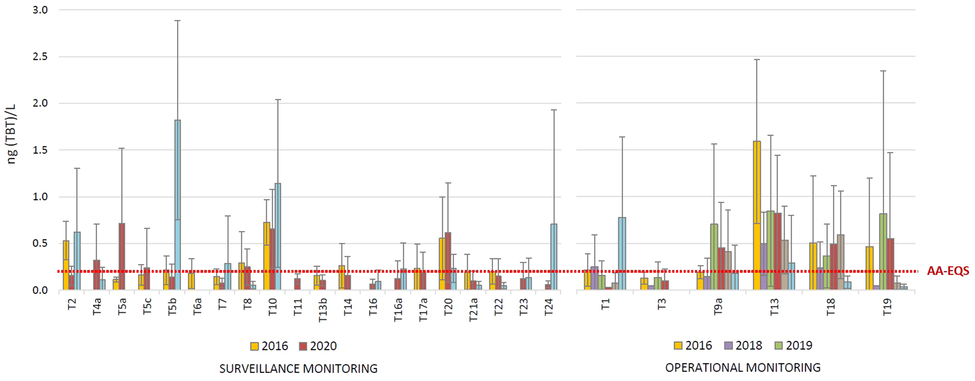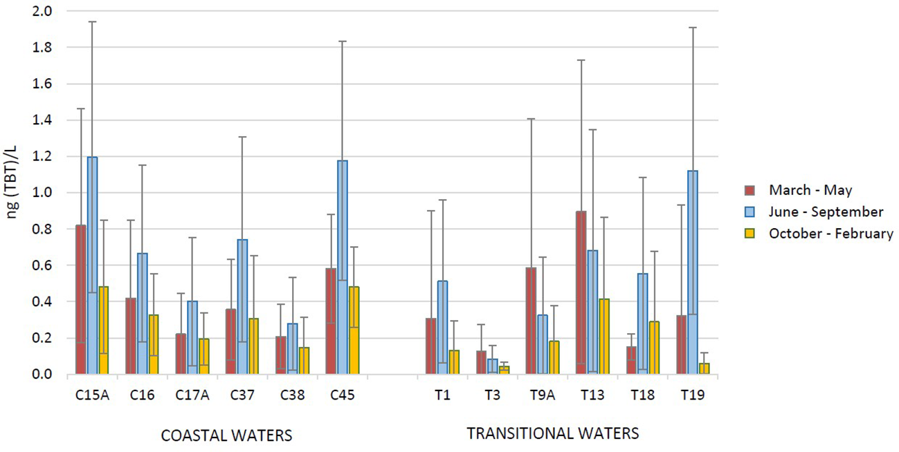 The seasonal distribution of TBT in the water column is shown in Supplementary Figures S1, S2 (for surveillance monitoring) and in Supplementary Figure S3 (for operational monitoring) where individual concentrations detected in each sampling campaign (season) at each site are presented. In the surveillance monitoring of coastal waters, the higher concentrations of TBT were more frequently detected in the winter season (i.e. November to February; average is 0.055 ± 0.13 ng(TBT)/L) than in spring (i.e. March to May; average is 0.004 ± 0.019 ng(TBT)/L) and summer (i.e. June to September; average is 0.032 ± 0.089 ng(TBT)/L) (Supplementary Figure S1); however, the concentrations in winter were not significantly higher compared to summer and spring seasons. On the other hand, in the big city ports studied as part of the operational monitoring, higher concentrations were generally found in the summer season, and were significantly higher than those in winter (Kruskal-Wallis test; p < 0.01). The average of all concentrations detected in summer months was 0.74 ± 0.38 ng(TBT)/L, while in spring and winter was 0.43 ± 0.23 and 0.32 ± 0.14 ng(TBT)/L, respectively (Supplementary Figure S3a). In the transitional waters, considering both surveillance (Supplementary Figure S2) and operational monitoring sites (Supplementary Figure S3b), higher TBT concentrations were found in spring and summer than in winter season (Kruskal-Wallis test; p < 0.05); an average of all concentrations detected in spring, summer and winter season was 0.35 ± 0.87, 0.30 ± 0.49 and 0.14 ± 0.18 ng(TBT)/L, respectively.