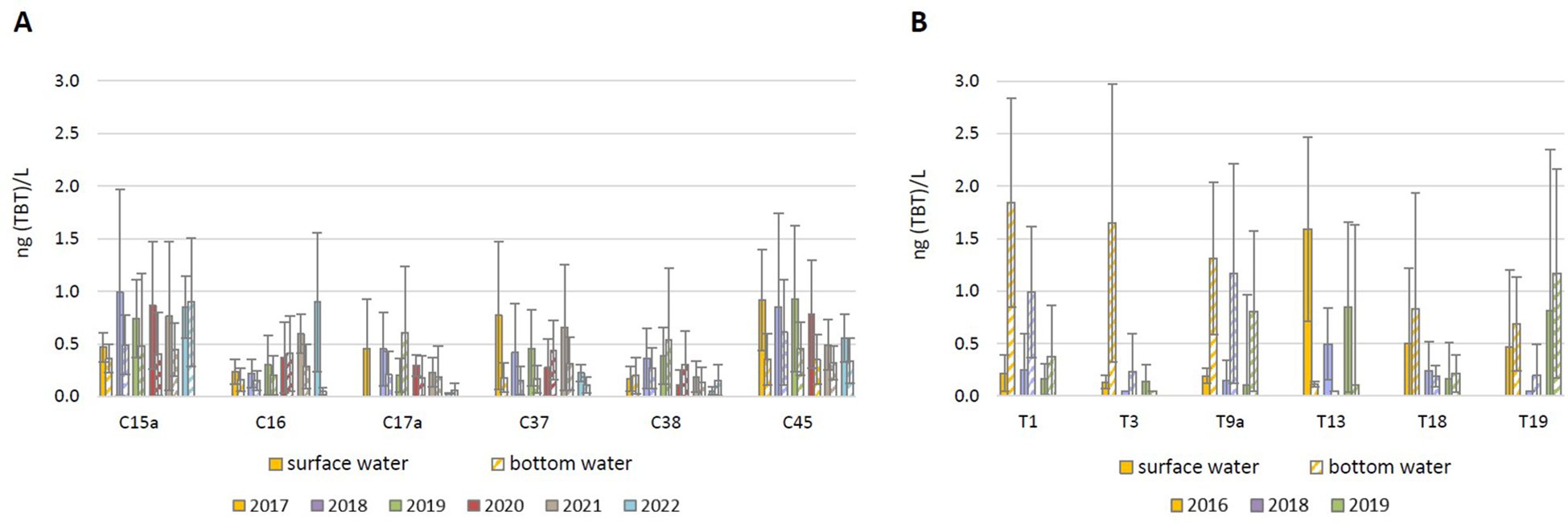 Average annual tributyltin (TBT) concentrations in the surface and bottom water layers at 6 sites in (A) coastal waters and (B) transitional waters, determined in the period 2016 - 2022 as part of the operational monitoring of the Croatian Adriatic within Water Framework Directive (2000/60/EC).