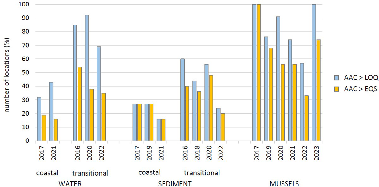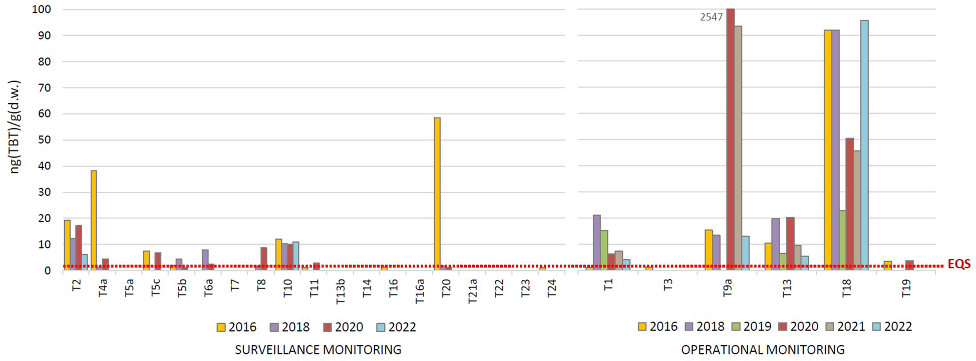 *for water - average annual TBT concentrations higher than 0.2 ng(TBT)/L (EU Directive 2013 or NN 20/23); for sediment - TBT concentration higher than 1.6 ng(TBT)/g(d.w.) (EU proposal 2023); for mussels - TBT concentrations higher than 12.0 ng(TBT)/g(d.w.) (OSPAR, 2004).
