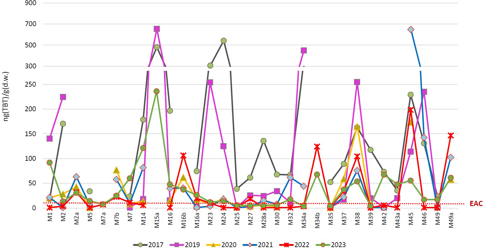 The spatial distribution of TBT in mussels sampled in coastal waters at 23 - 31 sites (depending on the year) in the period 2017 – 2023 is shown in Figure 7. In general, TBT was detected in mussels’ whole tissue at more than 75% of the sites, while in 2017 and 2023 it was detected at all sites. The exception is 2022, when it was detected at 43% of the sites. The individual concentrations ranged from <1 to 655 ng(TBT)/g(d.w.), while the average annual concentrations (considering all sites in a year) ranged from 28.9 ± 51.7 (2022) to 144.4 ± 137.6 ng(TBT)/g(d.w.) (2017), being significantly higher in 2017 than in 2019 - 2023. The high TBT levels [> EAChigh of 175 ng(TBT)/g(d.w.)] were found both in large city ports (M15a, M38 and M45) and in small local ports (M2, M23, M24 and M46). At half of the investigated sites, no decrease in TBT levels was observed over the entire period (M1, M7, M14, M15a, M16, M16b, M16a, M32, M37, M42, M43a, M45, M49 and M49a), while at other sites a decreasing trend in TBT concentrations from 2017 – 2019 to 2023 could be observed (M2, M2a, M7b, M23, M24, M27, M28a, M30, M38, M39 and M46) (Figure 7).
