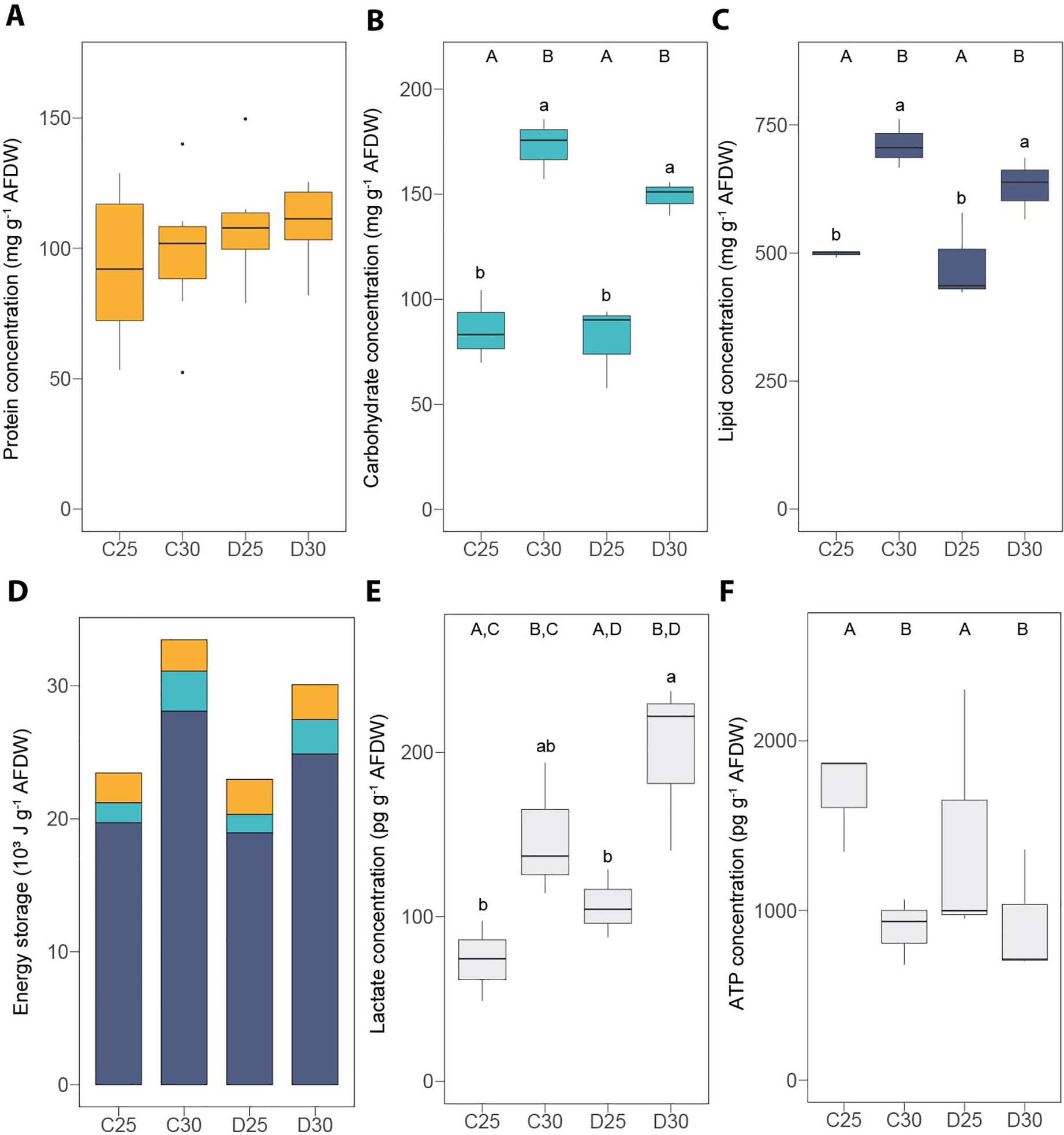 Energy reserves and metabolic compounds measured in the hard coral Stylophora pistillata exposed to different nutrient conditions and temperature treatments. (A) protein concentration, (B) lipid concentration, (C) carbohydrate concentration, (D) total energy storage, (E) lactate concentration and (F) ATP concentration. AFDW = ash-free dry weight. ATP = adenosine triphosphate. C25 = DINut control water, 25°C. C30 = DINut control water, 30°C. D25 = DINut depleted water, 25°C. D30 = DINut depleted water, 30°C. Upper-case letters indicate significant main effects of temperature (A, B) and DINut (C, D) as determined by generalized linear models. Pairwise significant differences resulting from Tukey’s HDS testing are displayed by lower-case letters (P < 0.05). Statistical tests were not performed on the total energy storage since lipids and carbohydrates were measured on different samples.