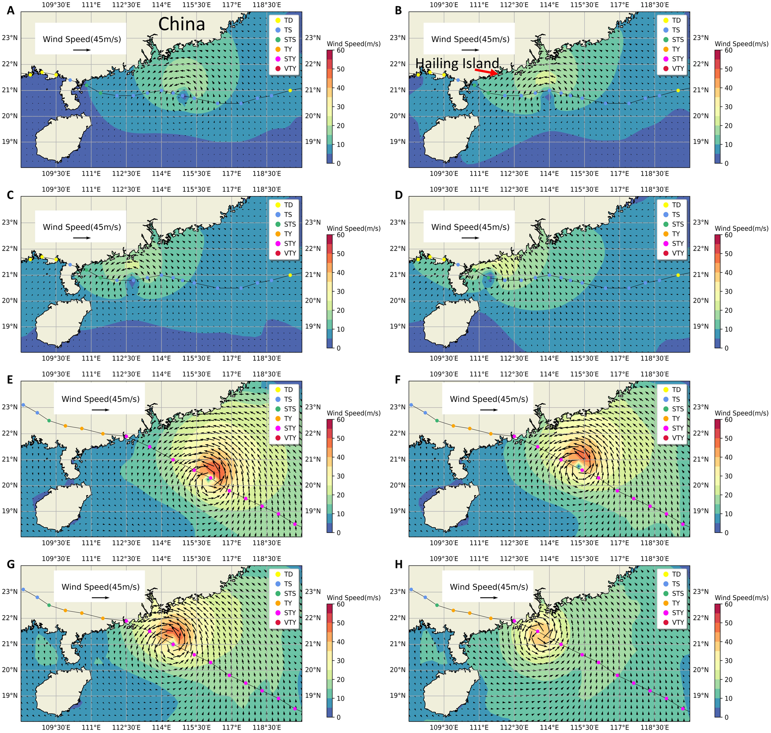 Tropical cyclone Barijat, a severe tropical storm and the 23rd typhoon of 2018, was initially categorized as a tropical depression by the China Meteorological Administration in the Luzon Strait on September 10th at 08:00. It initially affected the NSCS, causing notable storm surges. By September 11th, Barijat was classified as a tropical storm, and it progressed to a severe tropical storm by approximately 05:00 on September 13th. Around 08:30 on the same day, the typhoon made landfall along the coast of Zhanjiang City, Guangdong Province. At the time of landfall, the maximum near-center wind force reached 25 m/s, as shown in Figures 1A–D.