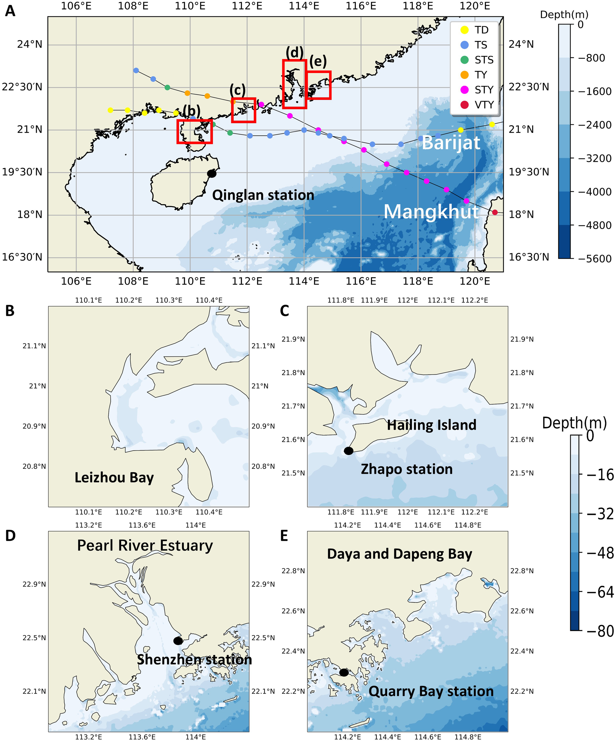 A topographic and bathymetric map of the NSCS and the four main bay regions. (A) shows the model’s domain and the designated areas highlighted within red rectangles from left to right: (B) Leizhou Bay, (C) Hailing Island, (D) Pearl River Estuary, and (E) Daya Bay and Dapeng Bay. The shading corresponds to the water depths within each respective region, while the black dots represent the locations of the four tidal gauge stations. The two lines and the points in (A) depict the tracks and strengths of Barijat and Mangkhut (2018).