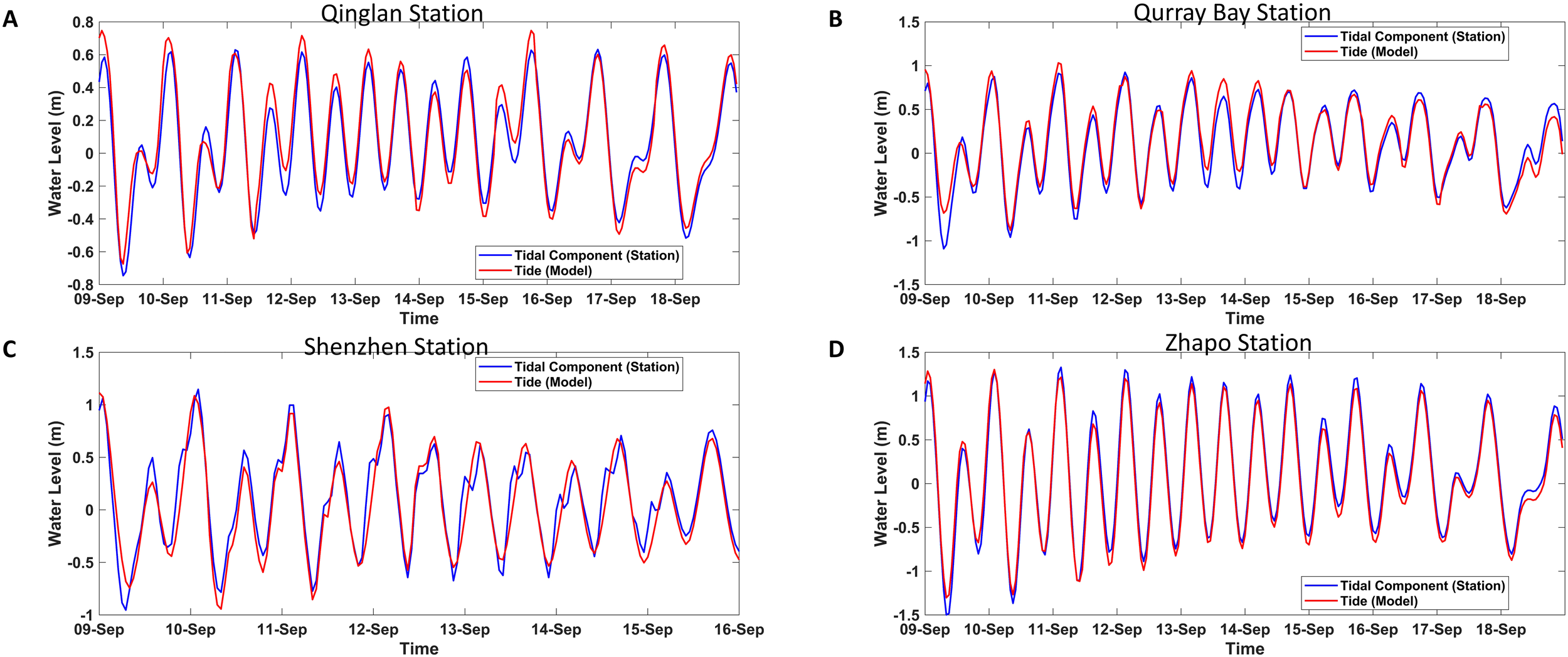 To evaluate the model’s capability in replicating tides, storm surges, and their interactions, we employed observational data covering the period from September 4 to September 18, 2018, from four tide gauge stations within the Global Sea Level Observing System (GLOSS) network: Qinglan station (19.57° N, 110.82° E), Quarry Bay station (22.29° N, 114.21° E), Shenzhen station (22.47° N, 113.88° E), and Zhapo station (21.58° N, 111.82° E). The locations of these stations are shown as black dots in Figure 2. The station data were sourced from the Global Sea Level Observing System’s Long-term Mean Sea Level Data (Caldwell et al., 2015) and the Flanders Marine Institute (VLIZ) and Intergovernmental Oceanographic Commission Sea Level Station Monitoring Facility (IOC), 2024.