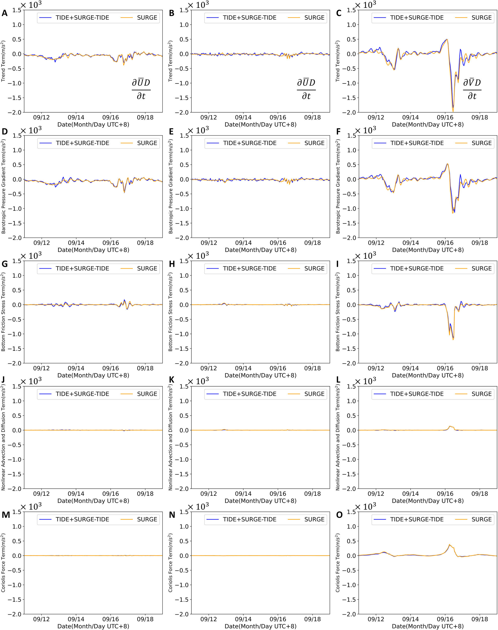 To further analyze the dynamic mechanisms underlying TSI and identify the specific processes driving in the Pearl River Estuary, Hailing Island, and Leizhou Bay, we employ the vertically integrated momentum equation (Mellor, 2004) as follows to elucidate the underlying physical mechanisms: