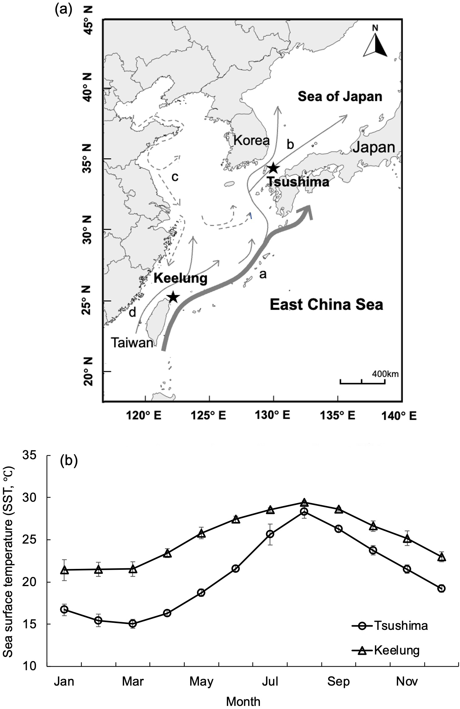 (A) Sampling localities (stars) off the Tsushima Islands (Japan) and off Keelung (Taiwan) and major current systems around the sampling locations. a, Kuroshio current; b, Tsushima warm current; c, East China Sea mainland coastal current; d, Taiwan Strait warm current. (B) Mean monthly sea surface temperature of waters off the Tsushima Islands and off Keelung during 2017-2020. The bars represent standard deviations.