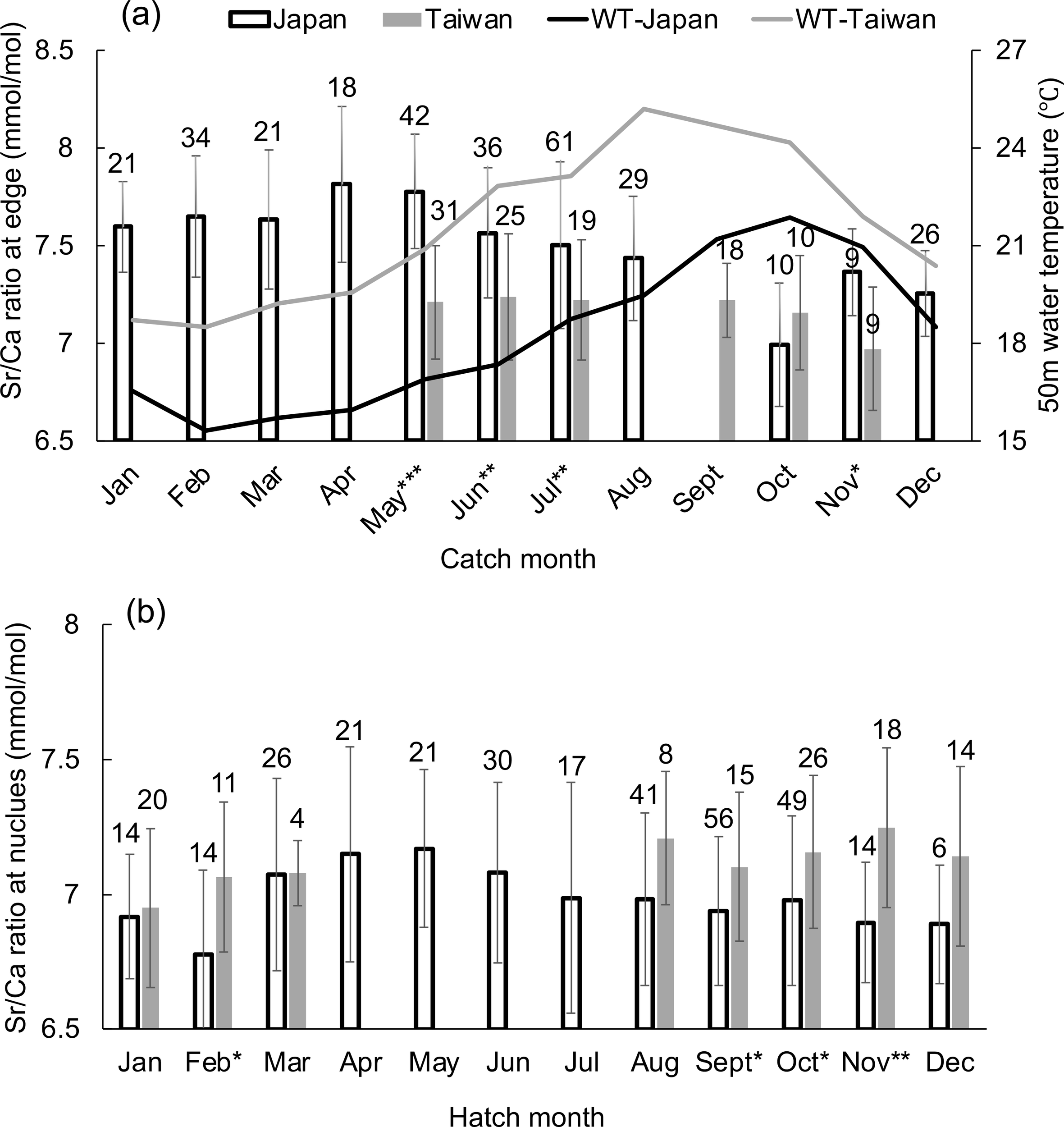 Therefore, in this study, statolith elemental analysis was conducted on the U. edulis squid population collected in Japan and Taiwan simultaneously for continuous three years. Firstly, variation in statolith trace elements were examined considering biotic and abiotic factors. Secondly, life trajectories of Sr/Ca ratio were applied to postulate the experienced environment. Finally, we discuss the population connectivity between southern Japan and northern Taiwan and its potential impacts on squid survival and maturation, and the underlying mechanism of U. edulis populations fluctuation to provide useful guidance as to appropriate fisheries management of this species.