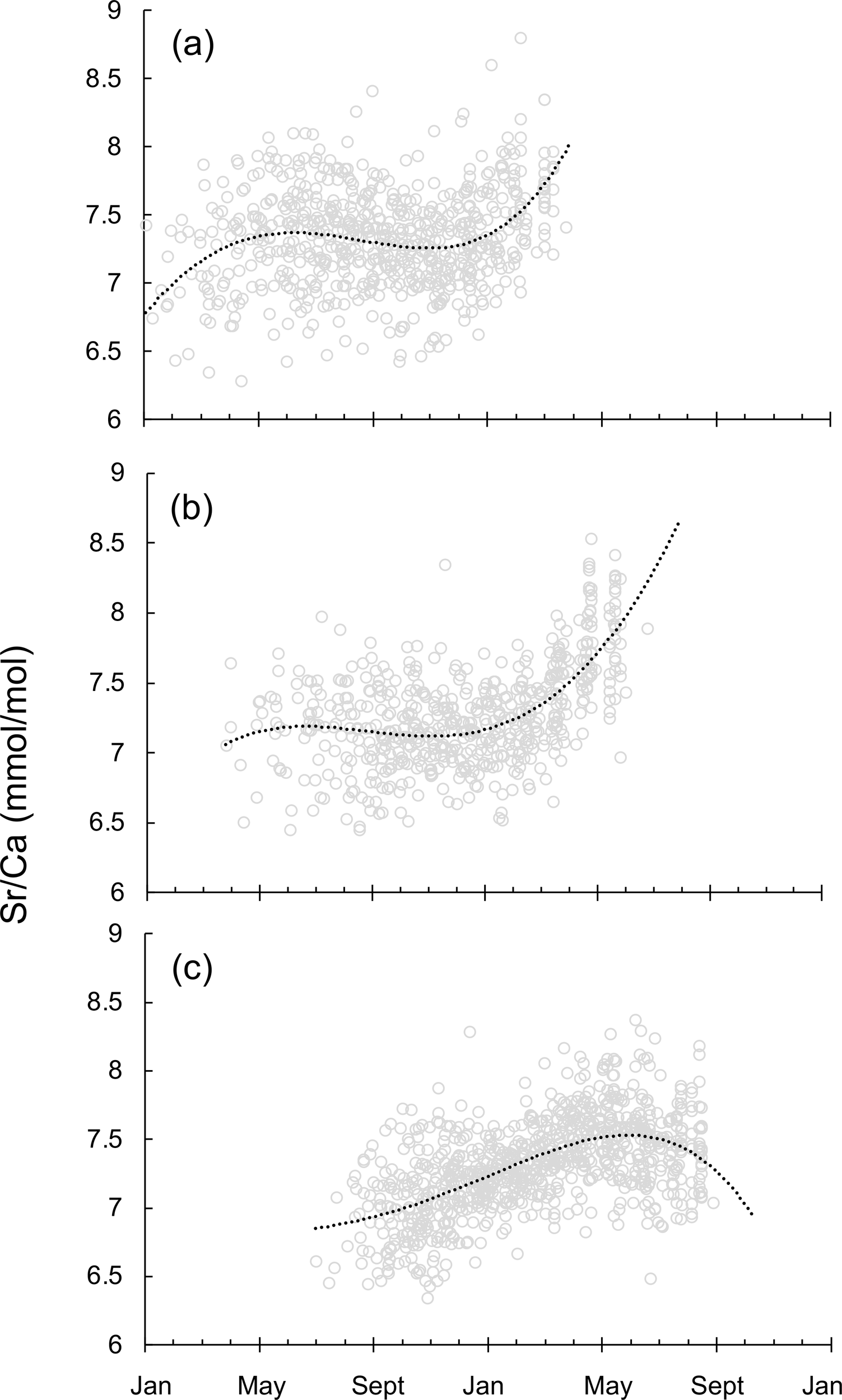 Furthermore, data of Sr/Ca ratios from the nucleus to the rostrum edge were applied to reflect the experienced environment of each mature individual throughout all life stages. The sample size, hatching period, age range, and ML range of mature individuals applied in establishing Sr/Ca ratio life trajectory for each spawning group were listed in the Table 3. Since age determination and trace elemental analysis were conducted on each of the two statoliths for each individual, the age interval of each individual was calculated by dividing the age of the individual by the number of its statolith ablation spots minus one. For each spawning group, a life trajectory of Sr/Ca ratios was established: estimated age at each ablation spot of mature individuals was used as independent variable, and the corresponding Sr/Ca ratio in the transect from nucleus to the rostrum edge as dependent variable. Polynomial models with different degrees from two to six were tested and compared using AIC (Akaike information criterion) to find the fit model for Sr/Ca ratio trajectories. A biquadratic polynomial function with a degree of four was selected because the AIC values polynomial models with a degree between four and five showed small differences, and we found it sufficient to describe the relationship between Sr/Ca ratio and its corresponding age while not overfitting.