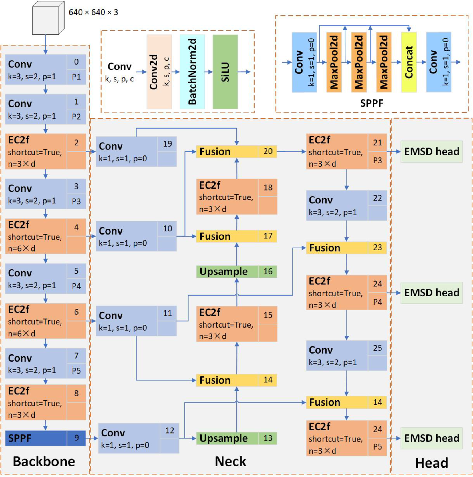 For the purpose of lightweighting the model network structure and extract fish features better, we have designed a feature pyramid network structure (EDBFPN) by using EDCN/EC2f. Then, we redesigned an efficient multi-scale decoupled head (EMSD head) to reduce the model’s parameter count and FLOPs. The EMSD head can obtain multi-scale feature maps through cheap convolution operations.
