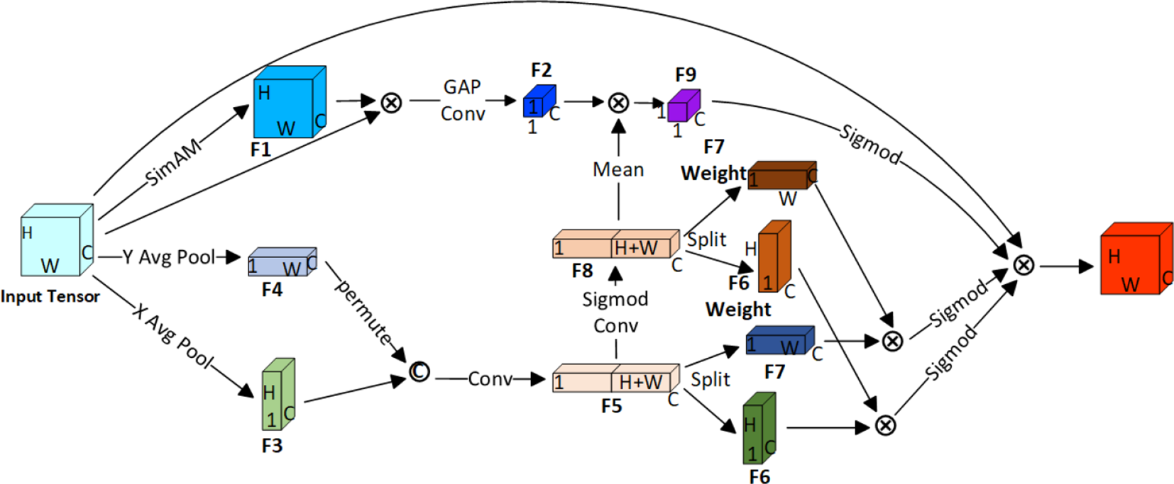 To obtain more refined and meaningful information, we perform additional convolution operations on tensor F5. Then, we use Sigmod operation to obtain tensor F8 with weights on both the width and height dimensions. We use channel splitting after transposing the tensor to obtain separate weight matrices F6 weight and F7 weight for the width and height directions, respectively. Tensor F8 takes the mean value and multiplied with tensor F2 to obtain tensor F9.