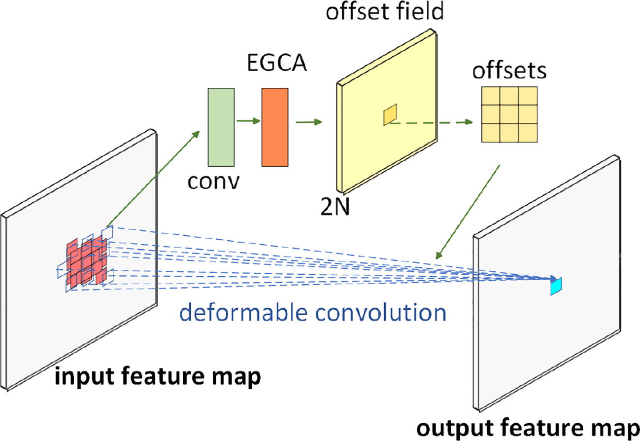 However, earlier implementations of deformable convolution derived the offset amounts needed to reshape the kernels by simply applying additional convolutional layers to the same input feature maps. Recognizing the necessity to solve the difficulty of feature extraction caused by fish swimming, we innovatively integrated the EGCA mechanism with deformable convolution, thus giving birth to the EGCA-based deformable convolutional network (EDCN), which is visually illustrated in Figure 3. Our EDCN employs a convolutional operation coupled with an EGCA attention module to compute the finely calibrated offset quantities required for the deformable convolutional kernels.