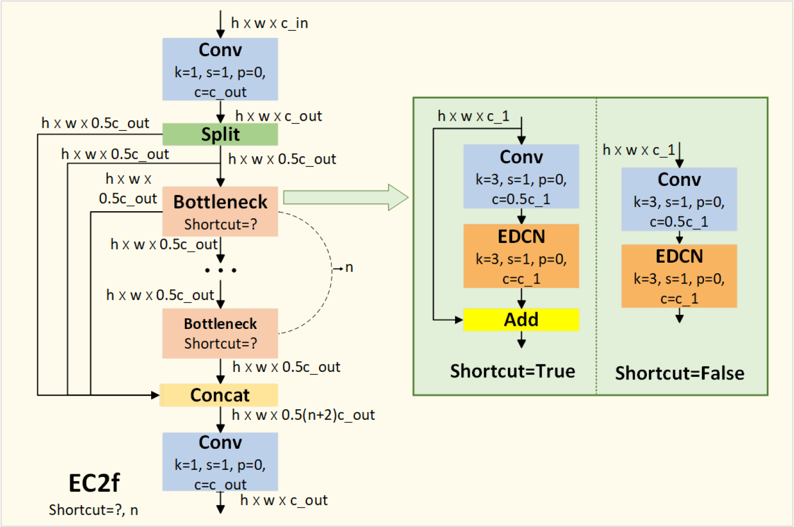 Structure of EC2f. The shortcut represents whether to make a residual connection or not. n represents the number of stacked Bottleneck modules.