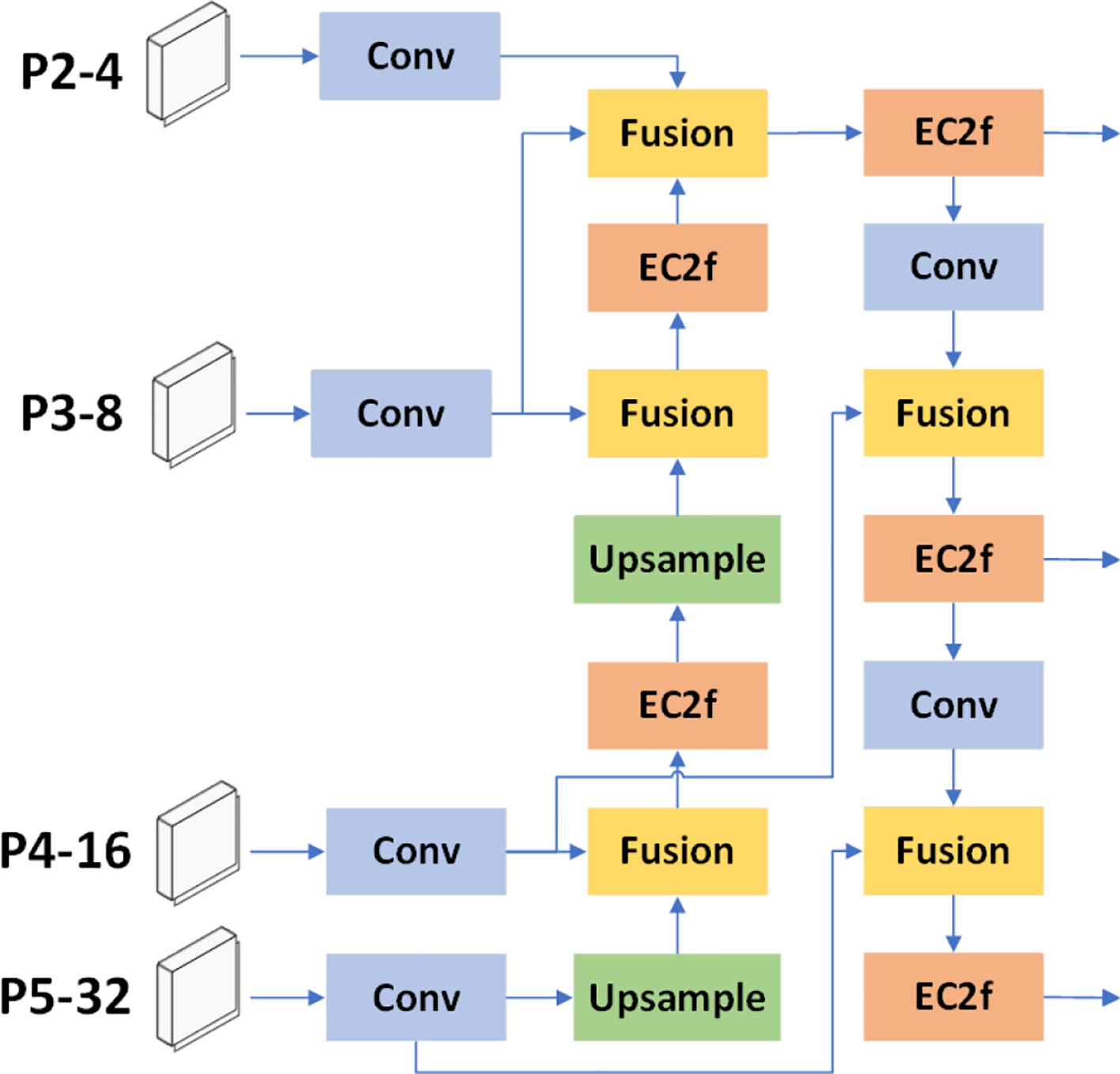 The BiFPN (Tan et al., 2020) is a hierarchical feature network structure that enables bidirectional feature fusion between different levels of feature pyramids. Through top-down and bottom-up feature propagation and fusion, BiFPN can effectively combine low-level detail features and high-level semantic features, providing multi-scale and multi-dimensional feature expression capabilities.