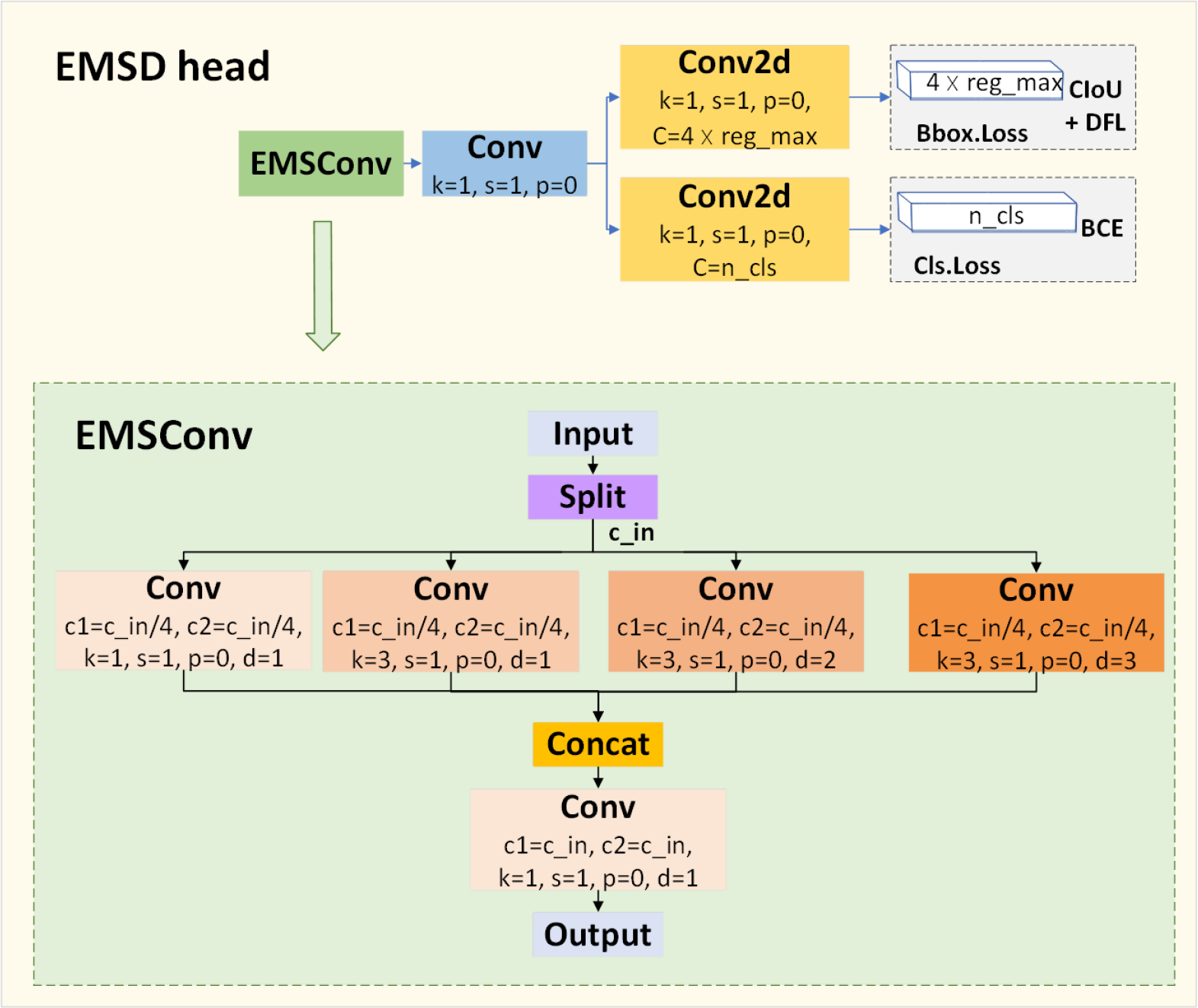 Han et al. (2020) and Tang et al. (2022) found that traditional neural networks often produce excessive and redundant feature numbers, which lead to additional parameters and floating-point operations. Pointwise convolution acts as an upward and downward transformation of feature channels. Howard et al. (2017); Sandler et al. (2018), and Howard et al. (2019) discovered and utilized pointwise convolution to fuse features across different channels. Yu and Koltun (2015) and Yu et al. (2017) pointed out that using dilated convolution can enlarge the receptive field of the feature map without changing its shape and ensure that the input and output feature maps have the same shape. Wang et al. (2018) suggested that using multiple expansion coefficients with different dilation rates leads to better performance when performing dilated convolution. To maintain high accuracy and lightweight models, we redesigned an efficient multi-scale decoupling head (EMSD head) with a new structure, as shown in Figure 6. In the EMSD head, we design an efficient multi-scale convolution module (EMSConv) that can obtain multi-scale features at a low cost. To obtain multi-scale features without increasing the number of parameters and floating-point operations, we first divide the input feature channel into four parts. The first part uses a regular convolution kernel with a size of 1 and no dilation. In the second, third, and fourth parts, we use convolution kernels with the size of 3 and the dilation rates of 1, 2, and 3, respectively, for dilated convolution. We concatenate the four feature maps obtained after each convolution operation and then use pointwise convolution to fuse the features across different channels.