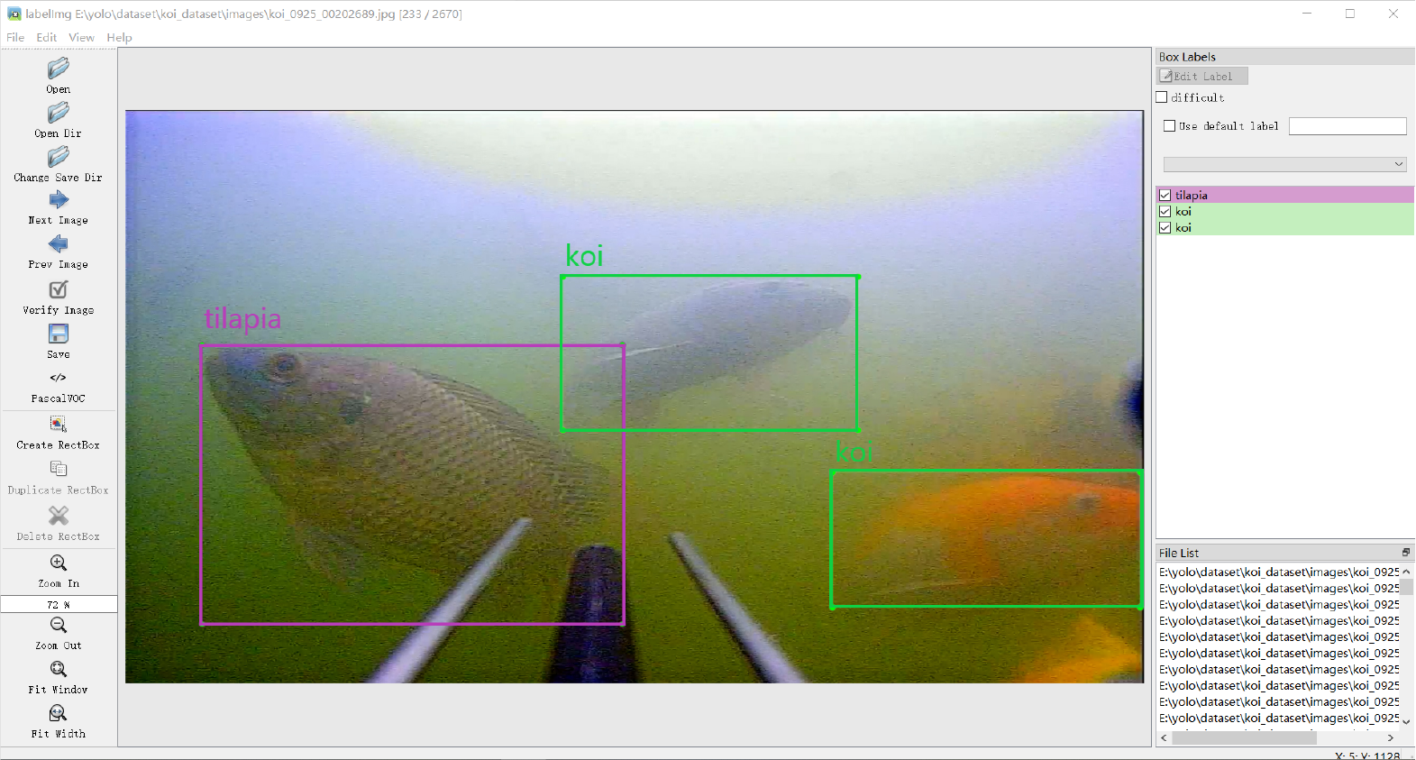Dataset labeling. Tilapia is in the purple box. Koi fish is in the green box.